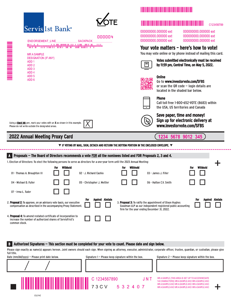 7 3 C V F o r W ithhold 1. Election of Directors: To elect the following persons to serve as directors for a one - year term until the 2023 Annual Meeting: For Withhold For Withhold 01 - Thomas A. Broughton III 02 - J. Richard Cashio 03 - James J. Filler 04 - Michael D . F uller 05 - Chri s t opher J . M e t tler 06 - Ha t t on C . V . Smith 07 - Irma L. Tuder Using a black ink pen, mark your votes with an X as shown in this example. Please do not write outside the designated areas. 0 3L9 W C + + Please sign exactly as name(s) appears hereon. Joint owners should each sign. When signing as attorney, executor, administrator, corporate officer, trustee, guardian, or custodian, please give full title. Date (mm/dd/yyyy) — Please print date below. Signature 1 — Please keep signature within the box. Signature 2 — Please keep signature within the box. Authorized Signatures — This section must be completed for your vote to count. Please date and sign below. B T IF VOTING BY MAIL, SIGN, DETACH AND RETURN THE BOTTOM PORTION IN THE ENCLOSED ENVELOPE. T 2022 Annual Meeting Proxy Card 1234 5678 9012 345 Proposals — The Board of Directors recommends a vote FOR all the nominees listed and FOR Proposals 2, 3 and 4. A 2. Proposal 2: To approve, on an advisory vote basis, our executive compensation as described in the accompanying Proxy Statement. 3 . P r o p o s a l 3 : T o ratify the appointment o f Di x on Hughe s Goodman LLP as our independent registered public accounting firm for the year ending December 31, 2022. For Against Abstain For Against Abstain 4. Proposal 4: To amend restated certificate of incorporation to increase the number of authorized shares of ServisFirst’s common stock. 000004 ENDORSEMENT_LINE______________ SACKPACK_____________ MR A SAMPLE DESIGN A TION (IF ANY) ADD 1 ADD 2 ADD 3 ADD 4 ADD 5 ADD 6 MMMMMMMM M MMMMMMMMMMMM MMMMMMMMMMMMMM 5 3 2 4 0 7 MR A SAMPLE (THIS AREA IS SET UP TO ACCOMMODATE 14 0 CHARACTERS) M R A SAMPLE AND M R A SAMPLE AND M R A SAMPLE AND M R A SAMPLE AND M R A SAMPLE AND M R A SAMPLE AND M R A SAMPLE AND M R A SAMPLE AND C 1234567890 J N T C123456789 MMMMMM 000000000.00000 0 ext 000000000.00000 0 ext 000000000.00000 0 ext 000000000.00000 0 ext 000000000.00000 0 ext 000000000.00000 0 ext If no electronic voting, delete QR code and control # Δ ≈ Online Go t o ww w . i n v e s t or v o t e .c o m / S F BS or s c an the QR c ode — login d e t ails a re located in the shaded bar below. Phone Call toll free 1 - 800 - 652 - VOTE (8683) within the U S A, US t erri t orie s and C anada Save paper, time and money! Sign up for electronic delivery at www.investorvote.com/SFBS Your vote matters – here’s how to vote! You may vote online or by phone instead of mailing this card. Votes submitted electronically must be received by 11:59 pm, Central Time, on May 5, 2022.