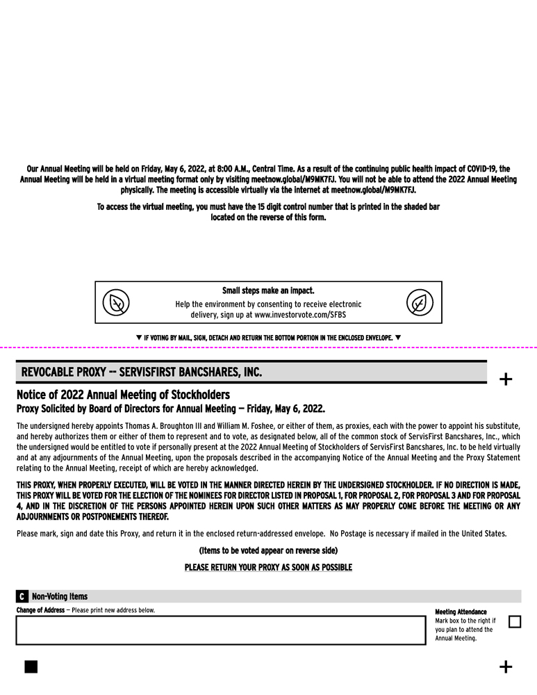 Small steps make an impact. Help the environment by consenting to receive electronic delivery, sign up at www.investorvote.com/SFBS Notice of 2022 Annual Meeting of Stockholders Proxy Solicited by Board of Directors for Annual Meeting — Friday, May 6, 2022. The undersigned hereby appoints Thomas A . Broughton III and William M . Foshee, or either of them, as proxies, each with the power to appoint his substitute, and hereby authorizes them or either of them to represent and to vote, as designated below, all of the common stock of ServisFirst Bancshares, Inc . , which the undersigned would be entitled to vote if personally present at the 2022 Annual Meeting of Stockholders of ServisFirst Bancshares, Inc . to be held virtually and at any adjournments of the Annual Meeting, upon the proposals described in the accompanying Notice of the Annual Meeting and the Proxy Statement relating to the Annual Meeting, receipt of which are hereby acknowledged . THIS PROXY, WHEN PROPERLY EXECUTED, WILL BE VOTED IN THE MANNER DIRECTED HEREIN BY THE UNDERSIGNED STOCKHOLDER . IF NO DIRECTION IS MADE, THIS PROXY WILL BE VOTED FOR THE ELECTION OF THE NOMINEES FOR DIRECTOR LISTED IN PROPOSAL 1 , FOR PROPOSAL 2 , FOR PROPOSAL 3 AND FOR PROPOSAL 4 , AND IN THE DISCRETION OF THE PERSONS APPOINTED HEREIN UPON SUCH OTHER MATTERS AS MAY PROPERLY COME BEFORE THE MEETING OR ANY ADJOURNMENTS OR POSTPONEMENTS THEREOF . Please mark, sign and date this Proxy, and return it in the enclosed return - addressed envelope . No Postage is necessary if mailed in the United States . (Items to be voted appear on reverse side) PLE A SE RETUR N Y OU R P R O X Y A S SOO N A S P OS SIBLE RE V OC ABLE P R O X Y -- SE R VIS F IR S T B AN C SHAR E S , IN C . T IF VOTING BY MAIL, SIGN, DETACH AND RETURN THE BOTTOM PORTION IN THE ENCLOSED ENVELOPE. T Non - Voting Items C + + Meeting Attendance Mark box to the right if you plan to attend the Annual Meeting. Change of Address — Please print new address below. Our Annual Meeting will be held on Friday, May 6, 2022, at 8:00 A.M., Central Time. As a result of the continuing public health impact of COVID - 19, the Annual Meeting will be held in a virtual meeting format only by visiting meetnow.global/M9MK7FJ. You will not be able to attend the 2022 Annual Meeting physically. The meeting is accessible virtually via the internet at meetnow.global/M9MK7FJ. To access the virtual meeting, you must have the 15 digit control number that is printed in the shaded bar located on the reverse of this form.