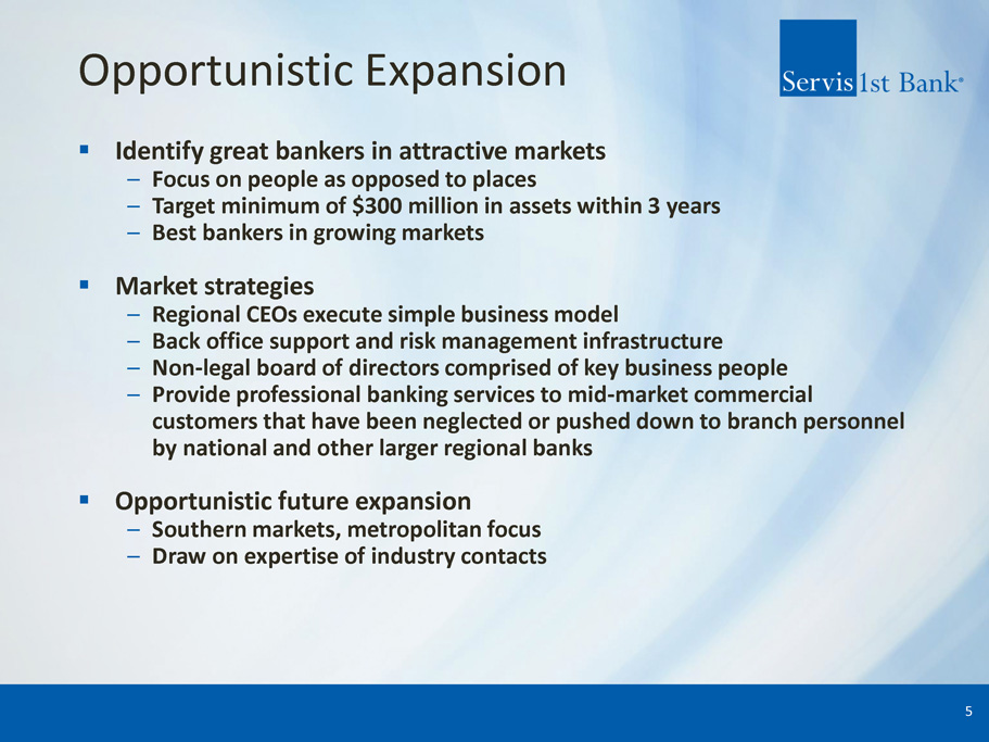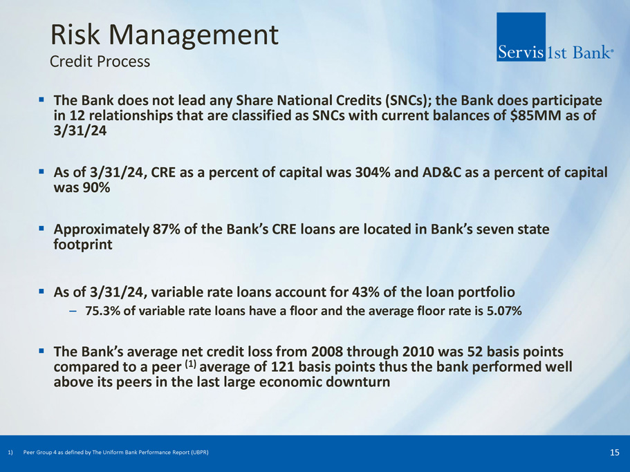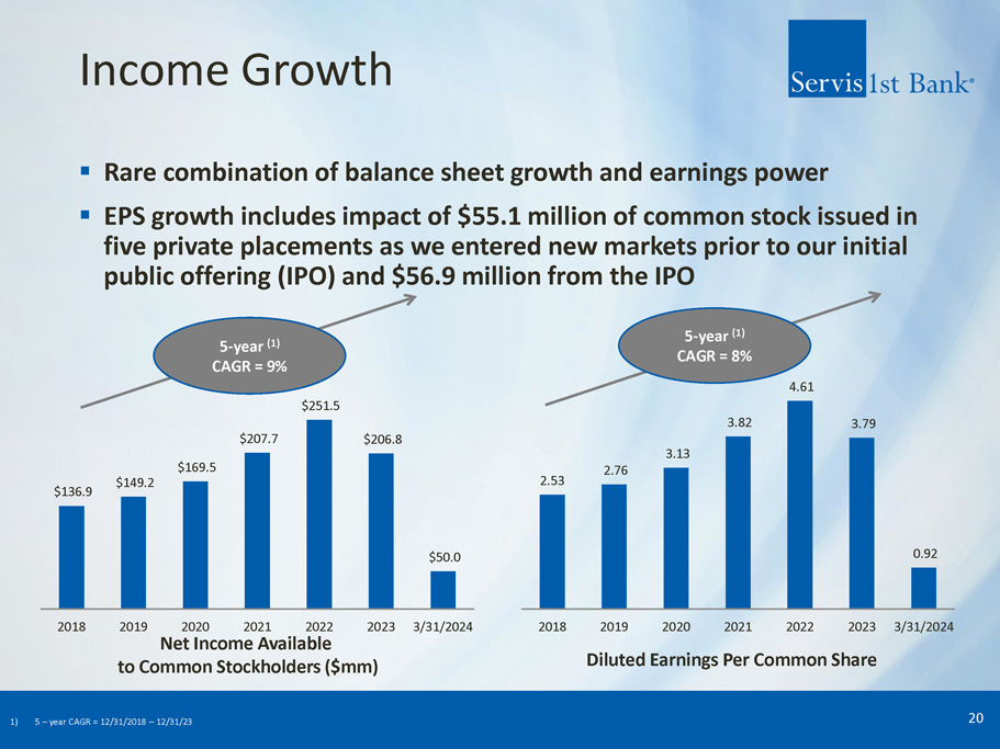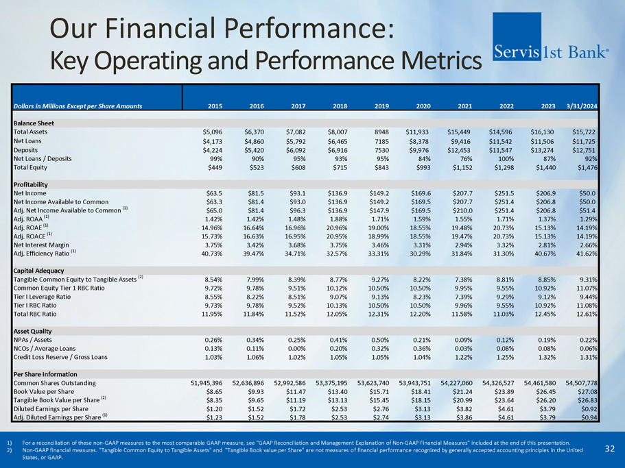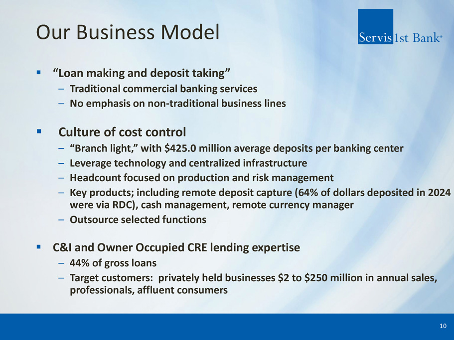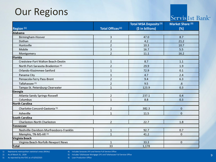 ServisFirst at a Glance Overview ▪ Founded in 2005 in Birmingham, AL ▪ Single bank BHC High - Performing Metropolitan Commercial Bank ▪ Total Assets (1) : $15.72 billion ▪ Stockholders’ Equity (1) : $1.48 billion High Growth Coupled with Pristine Credit Metrics (3) ▪ Gross Loans CAGR: 15% ▪ Total Deposits CAGR: 16% ▪ Net Income for Common CAGR: 18% ▪ Diluted EPS CAGR: 15% ▪ ROAA (2) : 1.26% ▪ Efficiency Ratio (2) : 43.30% 1) As of March 31, 2024 2) For three months ended March 31, 2024 3) 10 - year compounded annual growth rate (CAGR) calculated from 10 – year CAGR = 12/31/13 – 12/31/23 ▪ NPAs / assets (1) : 0.22% ▪ NPLs / loans (1) : 0.29% 3