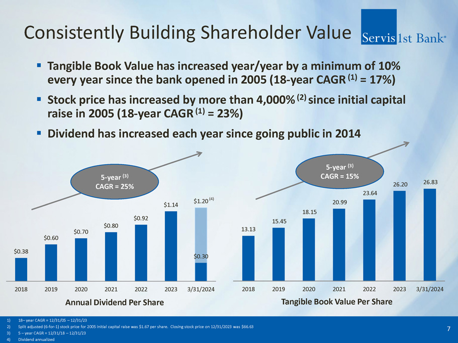 Milestones 6 ▪ Founded in May 2005 with initial capital raise of $35 million ▪ Reached profitability during the fourth quarter of 2005 and have been profitable every quarter since ▪ Achieved total asset milestones of $1 billion in 2008, $2 billion in 2011, $3 billion in 2013, $4 billion in 2014, $5 billion in 2015, $6 billion in 2016, $7 billion in 2017, $8 billion in 2018, $9 billion in 2019, $11 billion in 2020, $15 billion in 2021, and $16 billion in 2023 ’13: April - Nashville, TN April - Mobile, AL January ‘15: Metro Bank Acquisition August ’06: Huntsville, AL September ’08: Dothan, AL January ‘17: Fairhope, AL August '19: SW Florida LPO April ’21: Orlando, FL LPO February ’24: Memphis, TN LPO May ’05: Founded in Birmingham, AL June ’07: Montgomery, AL ’11: March - Correspondent Banking April - Pensacola, FL May ’14: Initial Public Offering January ’15: Charleston, SC January ’16: Tampa Bay, FL September ‘18: Fort Walton, FL August ‘20: Columbus, GA ’22: March - Panama City, FL LPO May - Piedmont, NC May - Tallahassee, FL September - Asheville, NC April ’23: Virginia Beach, VA 2005 2007 2009 2011 2013 2015 2017 2019 2021 2023