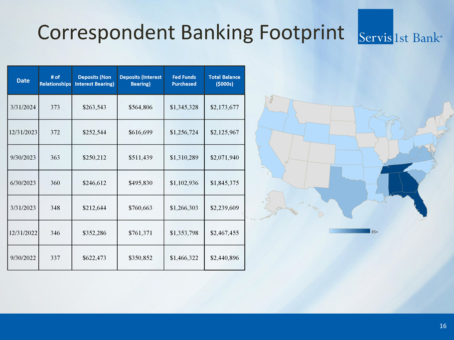 Risk Management Credit Process ▪ The Bank does not lead any Share National Credits (SNCs); the Bank does participate in 12 relationships that are classified as SNCs with current balances of $85MM as of 3/31/24 ▪ As of 3/31/24, CRE as a percent of capital was 304% and AD&C as a percent of capital was 90% ▪ Approximately 87% of the Bank’s CRE loans are located in Bank’s seven state footprint ▪ As of 3/31/24, variable rate loans account for 43% of the loan portfolio – 75.3% of variable rate loans have a floor and the average floor rate is 5.07% ▪ The Bank’s average net credit loss from 2008 through 2010 was 52 basis points compared to a peer (1) average of 121 basis points thus the bank performed well above its peers in the last large economic downturn 15 1) Peer Group 4 as defined by The Uniform Bank Performance Report (UBPR)