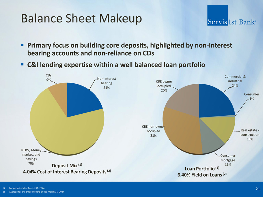 Income Growth ▪ Rare combination of balance sheet growth and earnings power ▪ EPS growth includes impact of $55.1 million of common stock issued in five private placements as we entered new markets prior to our initial public offering (IPO) and $56.9 million from the IPO 20 5 - year (1) CAGR = 9% Net Income Available to Common Stockholders ($mm) Diluted Earnings Per Common Share 1) 5 – year CAGR = 12/31/2018 – 12/31/23 5 - year (1) CAGR = 8% $136.9 $149.2 $169.5 $207.7 $251.5 $206.8 $50.0 2018 2019 2020 2021 2022 2023 3/31/2024 2.53 2.76 3.13 3.82 4.61 3.79 0.92 2018 2019 2020 2021 2022 2023 3/31/2024