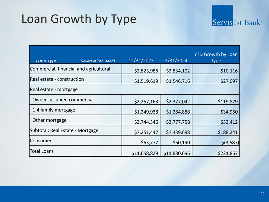 Loan Growth by Type 22 YTD Growth by Loan Type 3/31/2024 12/31/2023 Loan Type Dollars in Thousands $10,116 $2,834,102 $2,823,986 Commercial, financial and agricultural $27,097 $1,546,716 $1,519,619 Real estate - construction Real estate - mortgage $119,879 $2,377,042 $2,257,163 Owner - occupied commercial $34,950 $1,284,888 $1,249,938 1 - 4 family mortgage $33,412 $3,777,758 $3,744,346 Other mortgage $188,241 $7,439,688 $7,251,447 Subtotal: Real Estate - Mortgage $(3,587) $60,190 $63,777 Consumer $221,867 $11,880,696 $11,658,829 Total Loans