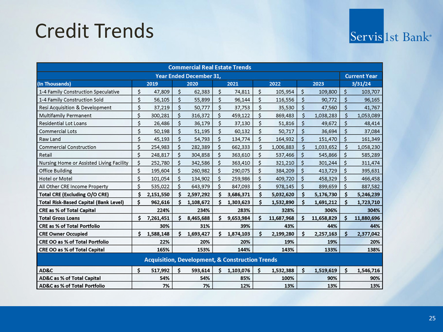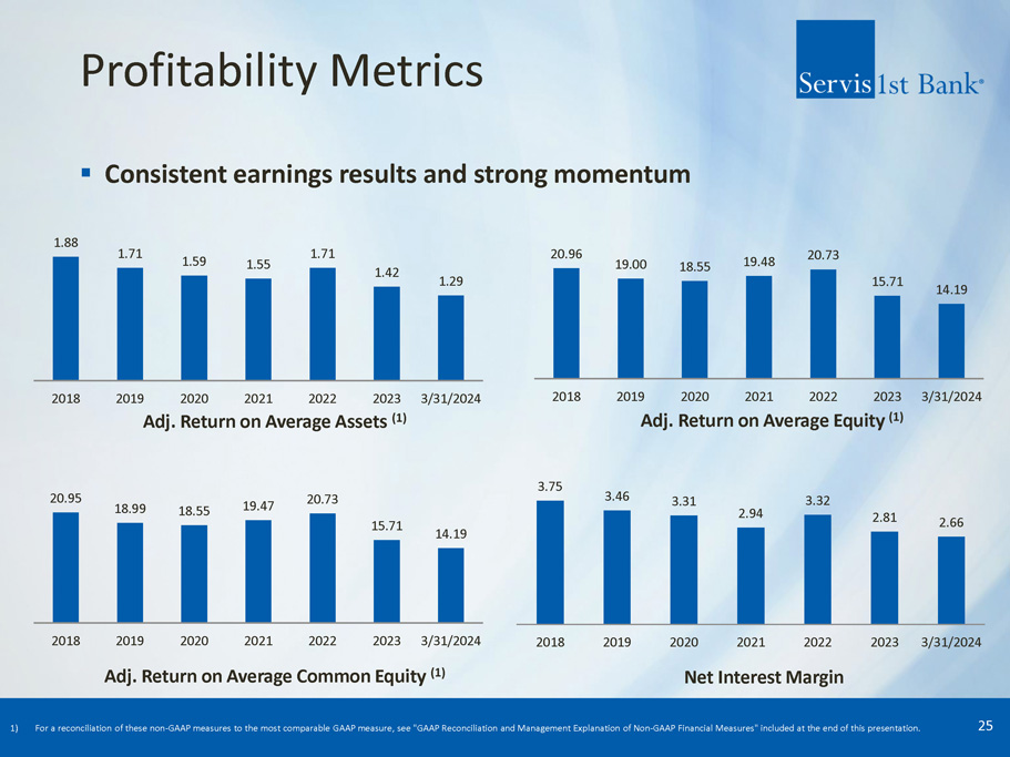 24 ▪ Strong loan growth while maintaining asset quality discipline Allowance for Credit Losses / Total Loans Net Charge Offs / Total Average Loans Non - Performing Assets / Total Assets Non - Performing Loans / Total Loans Credit Quality 0.41% 0.50% 0.21% 0.09% 0.12% 0.14% 0.22% 2018 2019 2020 2021 2022 2023 3/31/2024 0.43% 0.50% 0.22% 0.13% 0.15% 0.18% 0.29% 2018 2019 2020 2021 2022 2023 3/31/2024 0.20% 0.32% 0.36% 0.03% 0.08% 0.10% 0.06% 2018 2019 2020 2021 2022 2023 3/31/2024 1.05% 1.05% 1.04% 1.22% 1.25% 1.32% 1.31% 2018 2019 2020 2021 2022 2023 3/31/2024