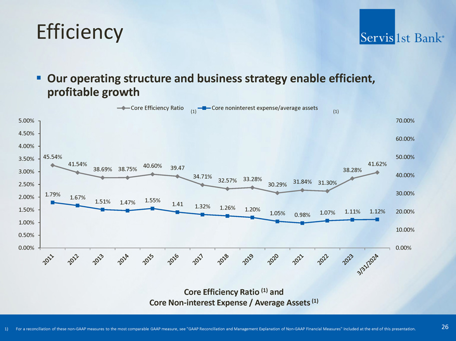 Profitability Metrics ▪ Consistent earnings results and strong momentum 25 Adj. Return on Average Assets (1) Adj. Return on Average Equity (1) Adj. Return on Average Common Equity (1) Net Interest Margin 1) For a reconciliation of these non - GAAP measures to the most comparable GAAP measure, see "GAAP Reconciliation and Management Exp lanation of Non - GAAP Financial Measures" included at the end of this presentation. 1.88 1.71 1.59 1.55 1.71 1.42 1.29 2018 2019 2020 2021 2022 2023 3/31/2024 20.96 19.00 18.55 19.48 20.73 15.71 14.19 2018 2019 2020 2021 2022 2023 3/31/2024 20.95 18.99 18.55 19.47 20.73 15.71 14.19 2018 2019 2020 2021 2022 2023 3/31/2024 3.75 3.46 3.31 2.94 3.32 2.81 2.66 2018 2019 2020 2021 2022 2023 3/31/2024
