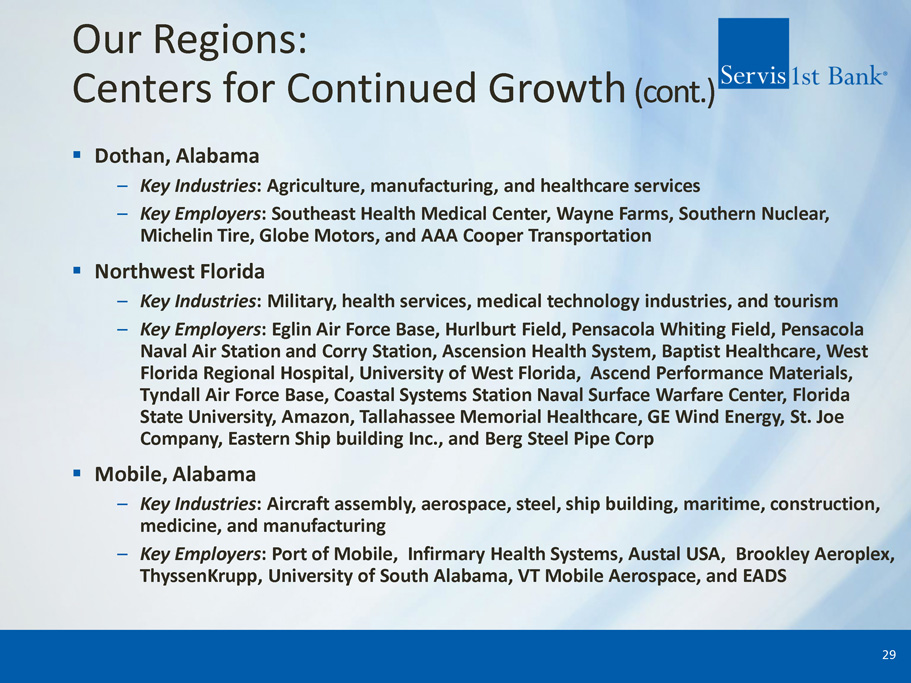 Our Regions: Centers for Continued Growth ▪ Birmingham, Alabama – Key Industries : Metals manufacturing, finance, insurance, healthcare services and distribution – Key Employers : Protective Life, Encompass Health, Vulcan Materials Company, AT&T, American Cast Iron Pipe Company, Southern Company, Shipt, and University of Alabama at Birmingham ▪ Huntsville, Alabama – Key Industries : U.S. government, aerospace/defense, commercial and university research – Key Employers : U.S. Army/Redstone Arsenal, Boeing Company, NASA/Marshall Space Flight Center, Intergraph Corporation, ADTRAN, Northrop Grumman, Technicolor, SAIC, DirecTV, Lockheed Martin, and Toyota Motor Manufacturing ▪ Montgomery, Alabama – Key Industries : U.S. and state government, U.S. Air Force , automotive manufacturing – Key Employers : Maxwell Gunter Air Force Base, State of Alabama, Baptist Health Systems, Hyundai Motor Manufacturing, and MOBIS Alabama 28
