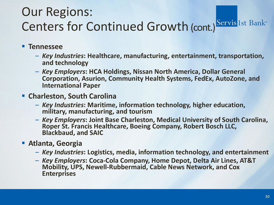 Our Regions: Centers for Continued Growth (cont.) ▪ Dothan, Alabama – Key Industries : Agriculture, manufacturing, and healthcare services – Key Employers : Southeast Health Medical Center, Wayne Farms, Southern Nuclear, Michelin Tire, Globe Motors, and AAA Cooper Transportation ▪ Northwest Florida – Key Industries : Military, health services, medical technology industries, and tourism – Key Employers : Eglin Air Force Base, Hurlburt Field, Pensacola Whiting Field, Pensacola Naval Air Station and Corry Station, Ascension Health System, Baptist Healthcare, West Florida Regional Hospital, University of West Florida, Ascend Performance Materials, Tyndall Air Force Base, Coastal Systems Station Naval Surface Warfare Center, Florida State University, Amazon, Tallahassee Memorial Healthcare, GE Wind Energy, St. Joe Company, Eastern Ship building Inc., and Berg Steel Pipe Corp ▪ Mobile, Alabama – Key Industries : Aircraft assembly, aerospace, steel, ship building, maritime, construction, medicine, and manufacturing – Key Employers : Port of Mobile, Infirmary Health Systems, Austal USA, Brookley Aeroplex , ThyssenKrupp, University of South Alabama, VT Mobile Aerospace, and EADS 29