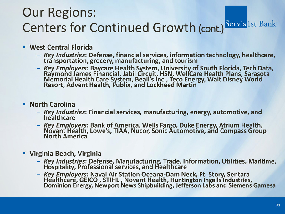 Our Regions: Centers for Continued Growth (cont.) ▪ Tennessee – Key Industries : Healthcare, manufacturing, entertainment, transportation, and technology – Key Employers : HCA Holdings, Nissan North America, Dollar General Corporation, Asurion, Community Health Systems, FedEx, AutoZone, and International Paper ▪ Charleston, South Carolina – Key Industries : Maritime, information technology, higher education, military, manufacturing, and tourism – Key Employers : Joint Base Charleston, Medical University of South Carolina, Roper St. Francis Healthcare, Boeing Company, Robert Bosch LLC, Blackbaud, and SAIC ▪ Atlanta, Georgia – Key Industries : Logistics, media, information technology, and entertainment – Key Employers : Coca - Cola Company, Home Depot, Delta Air Lines, AT&T Mobility, UPS, Newell - Rubbermaid, Cable News Network, and Cox Enterprises 30