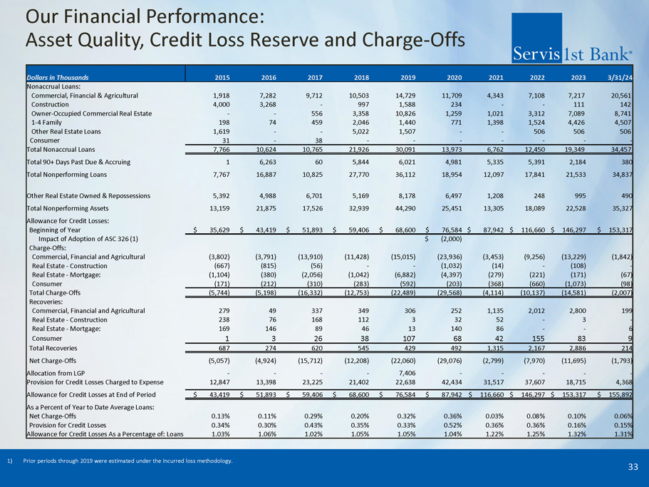 Our Financial Performance: Key Operating and Performance Metrics 32 1) For a reconciliation of these non - GAAP measures to the most comparable GAAP measure, see "GAAP Reconciliation and Management Exp lanation of Non - GAAP Financial Measures" included at the end of this presentation. 2) Non - GAAP financial measures. "Tangible Common Equity to Tangible Assets" and "Tangible Book value per Share" are not measures o f financial performance recognized by generally accepted accounting principles in the United States, or GAAP. Dollars in Millions Except per Share Amounts 3/31/2024 2023 2022 2021 2020 2019 2018 2017 2016 2015 Balance Sheet $15,722 $16,130 $14,596 $15,449 $11,933 8948 $8,007 $7,082 $6,370 $5,096 Total Assets $11,725 $11,506 $11,542 $9,416 $8,378 7185 $6,465 $5,792 $4,860 $4,173 Net Loans $12,751 $13,274 $11,547 $12,453 $9,976 7530 $6,916 $6,092 $5,420 $4,224 Deposits 92% 87% 100% 76% 84% 95% 93% 95% 90% 99% Net Loans / Deposits $1,476 $1,440 $1,298 $1,152 $993 $843 $715 $608 $523 $449 Total Equity Profitability $50.0 $206.9 $251.5 $207.7 $169.6 $149.2 $136.9 $93.1 $81.5 $63.5 Net Income $50.0 $206.8 $251.4 $207.7 $169.5 $149.2 $136.9 $93.0 $81.4 $63.3 Net Income Available to Common $5 1 . 4 $206.8 $251.4 $210.0 $169.5 $147.9 $136.9 $96.3 $81.4 $65.0 Adj. Net Income Available to Common (1) 1.2 9 % 1.37% 1.71% 1.55% 1.59% 1.71% 1.88% 1.48% 1.42% 1.42% Adj. ROAA (1) 14.19 % 15.13% 20.73% 19.48% 18.55% 19.00% 20.96% 16.96% 16.64% 14.96% Adj. ROAE (1) 14.19 % 15.13% 20.73% 19.47% 18.55% 18.99% 20.95% 16.95% 16.63% 15.73% Adj. ROACE (1) 2.6 6 % 2.81% 3.32% 2.94% 3.31% 3.46% 3.75% 3.68% 3.42% 3.75% Net Interest Margin 4 1 . 62% 40.67% 31.30% 31.84% 30.29% 33.31% 32.57% 34.71% 39.47% 40.73% Adj. Efficiency Ratio (1) Capital Adequacy 9.31% 8.85% 8.81% 7.38% 8.22% 9.27% 8.77% 8.39% 7.99% 8.54% Tangible Common Equity to Tangible Assets (2) 11.07% 10 . 9 2 % 9.55% 9.95% 10.50% 10.50% 10.12% 9.51% 9.78% 9 . 72 % Common Equity Tier 1 RBC Ratio 9.44% 9.12% 9.29% 7.39% 8.23% 9.13% 9.07% 8.51% 8.22% 8.55% Tier I Leverage Ratio 11.08% 10.92% 9.55% 9.96% 10.50% 10.50% 10.13% 9.52% 9.78% 9.73% Tier I RBC Ratio 12.61% 12.45% 11.03% 11.58% 12.20% 12.31% 12.05% 11.52% 11.84% 11.95% Total RBC Ratio Asset Quality 0. 22 % 0.19% 0.12% 0.09% 0.21% 0.50% 0.41% 0.25% 0.34% 0.26% NPAs / Assets 0.0 6 % 0.08% 0.08% 0.03% 0.36% 0.32% 0.20% 0.00% 0.11% 0.13% NCOs / Average Loans 1.31% 1.32% 1.25% 1.22% 1.04% 1.05% 1.05% 1.02% 1.06% 1.03% Credit Loss Reserve / Gross Loans Per Share Information 54,507,778 54,461,580 54,326,527 54,227,060 53,943,751 53,623,740 53,375,195 52,992,586 52,636,896 51,945,396 Common Shares Outstanding $27.08 $26.45 $23.89 $21.24 $18.41 $15.71 $13.40 $11.47 $9.93 $8.65 Book Value per Share $26.83 $26.20 $23.64 $20.99 $18.15 $15.45 $13.13 $11.19 $9.65 $8.35 Tangible Book Value per Share (2) $0.92 $3.79 $4.61 $3.82 $3.13 $2.76 $2.53 $1.72 $1.52 $1.20 Diluted Earnings per Share $0.9 4 $3.79 $4.61 $3.86 $3.13 $2.74 $2.53 $1.78 $1.52 $1.23 Adj. Diluted Earnings per Share (1)