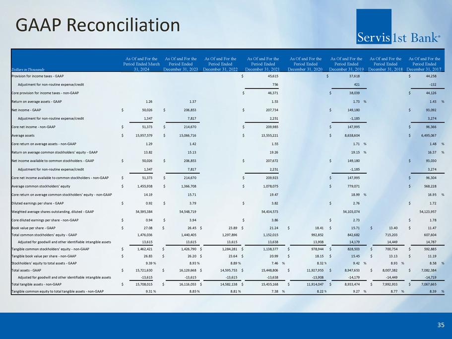 GAAP Reconciliation 35 As Of and For the Period Ended December 31, 2017 As Of and For the Period Ended December 31, 2018 As Of and For the Period Ended December 31, 2019 As Of and For the Period Ended December 31, 2020 As Of and For the Period Ended December 31, 2021 As Of and For the Period Ended December 31, 2022 As Of and For the Period Ended December 31, 2023 As Of and For the Period Ended March 31, 2024 Dollars in Thousands 44,258 $ 37,618 $ 45,615 $ Provision for income taxes - GAAP - 132 421 756 Adjustment for non - routine expense/credit 44,126 $ 38,039 $ 46,371 $ Core provision for income taxes - non - GAAP % 1.43 % 1.73 1.53 1.37 1.26 Return on average assets - GAAP 93,092 $ 149,180 $ 207,734 $ 206,853 $ 50,026 $ Net income - GAAP 3,274 - 1,185 2,251 7,817 1,347 Adjustment for non - routine expense/credit 96,366 $ 147,995 $ 209,985 $ 214,670 $ 51,373 $ Core net income - non - GAAP 6,495,067 $ 8,638,604 $ 13,555,221 $ 15,066,716 $ 15,957,579 $ Average assets % 1.48 % 1.71 1.55 1.42 1.29 Core return on average assets - non - GAAP % 16.37 % 19.15 19.26 15.13 13.82 Return on average common stockholders' equity - GAAP 93,030 $ 149,180 $ 207,672 $ 206,853 $ 50,026 $ Net income available to common stockholders - GAAP 3,274 - 1,185 2,251 7,817 1,347 Adjustment for non - routine expense/credit 96,304 $ 147,995 $ 209,923 $ 214,670 $ 51,373 $ Core net income available to common stockholders - non - GAAP 568,228 $ 779,071 $ 1,078,075 $ 1,366,708 $ 1,455,938 $ Average common stockholders' equity % 16.95 % 18.99 19.47 15.71 14.19 Core return on average common stockholders' equity - non - GAAP 1.72 $ 2.76 $ 3.82 $ 3.79 $ 0.92 $ Diluted earnings per share - GAAP 54,123,957 54,103,074 54,434,573 54,548,719 54,595,384 Weighted average shares outstanding, diluted - GAAP 1.78 $ 2.73 $ 3.86 $ 3.94 $ 0.94 $ Core diluted earnings per share - non - GAAP 11.47 $ 13.40 $ 15.71 $ 18.41 $ 21.24 $ 23.89 $ 26.45 $ 27.08 $ Book value per share - GAAP 607,604 715,203 842,682 992,852 1,152,015 1,297,896 1,440,405 1,476,036 Total common stockholders' equity - GAAP 14,787 14,449 14,179 13,908 13,638 13,615 13,615 13,615 Adjusted for goodwill and other identifiable intangible assets 592,885 $ 700,754 $ 828,503 $ 978,944 $ 1,138,377 $ 1,284,281 $ 1,426,790 $ 1,462,421 $ Tangible common stockholders' equity - non - GAAP 11.19 $ 13.13 $ 15.45 $ 18.15 $ 20.99 $ 23.64 $ 26.20 $ 26.83 $ Tangible book value per share - non - GAAP % 8.58 % 8.93 % 9.42 % 8.32 % 7.46 % 8.89 % 8.93 % 9.39 Stockholders' equity to total assets - GAAP 7,082,384 $ 8,007,382 $ 8,947,653 $ 11,927,955 $ 15,448,806 $ 14,595,753 $ 16,129,668 $ 15,721,630 $ Total assets - GAAP - 14,719 - 14,449 - 14,179 - 13,908 - 13,638 - 13,615 - 13,615 - 13,615 Adjusted for goodwill and other identifiable intangible assets 7,067,665 $ 7,992,933 $ 8,933,474 $ 11,914,047 $ 15,435,168 $ 14,582,138 $ 16,116,053 $ 15,708,015 $ Total tangible assets - non - GAAP % 8.39 % 8.77 % 9.27 % 8.22 % 7.38 % 8.81 % 8.85 % 9.31 Tangible common equity to total tangible assets - non - GAAP