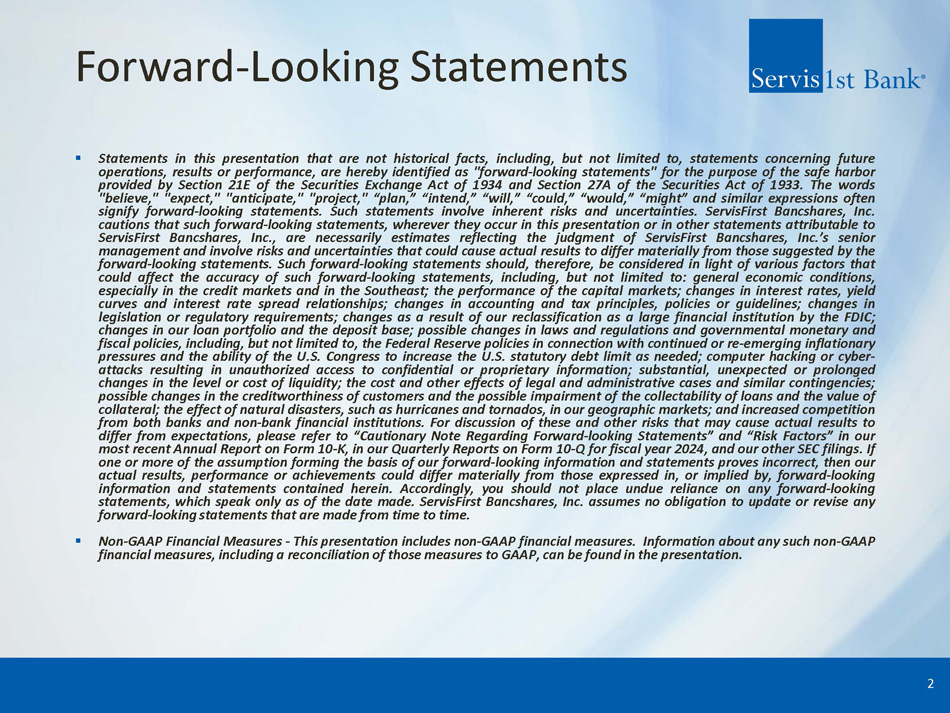 Forward - Looking Statements ▪ Statements in this presentation that are not historical facts, including, but not limited to, statements concerning future operations, results or performance, are hereby identified as "forward - looking statements" for the purpose of the safe harbor provided by Section 21 E of the Securities Exchange Act of 1934 and Section 27 A of the Securities Act of 1933 . The words "believe," "expect," "anticipate," "project," “plan,” “intend,” “will,” “could,” “would,” “might” and similar expressions often signify forward - looking statements . Such statements involve inherent risks and uncertainties . ServisFirst Bancshares, Inc . cautions that such forward - looking statements, wherever they occur in this presentation or in other statements attributable to ServisFirst Bancshares, Inc . , are necessarily estimates reflecting the judgment of ServisFirst Bancshares, Inc . ’s senior management and involve risks and uncertainties that could cause actual results to differ materially from those suggested by the forward - looking statements . Such forward - looking statements should, therefore, be considered in light of various factors that could affect the accuracy of such forward - looking statements, including, but not limited to : general economic conditions, especially in the credit markets and in the Southeast ; the performance of the capital markets ; changes in interest rates, yield curves and interest rate spread relationships ; changes in accounting and tax principles, policies or guidelines ; changes in legislation or regulatory requirements ; changes as a result of our reclassification as a large financial institution by the FDIC ; changes in our loan portfolio and the deposit base ; possible changes in laws and regulations and governmental monetary and fiscal policies, including, but not limited to, the Federal Reserve policies in connection with continued or re - emerging inflationary pressures and the ability of the U . S . Congress to increase the U . S . statutory debt limit as needed ; computer hacking or cyber - attacks resulting in unauthorized access to confidential or proprietary information ; substantial, unexpected or prolonged changes in the level or cost of liquidity ; the cost and other effects of legal and administrative cases and similar contingencies ; possible changes in the creditworthiness of customers and the possible impairment of the collectability of loans and the value of collateral ; the effect of natural disasters, such as hurricanes and tornados, in our geographic markets ; and increased competition from both banks and non - bank financial institutions . For discussion of these and other risks that may cause actual results to differ from expectations, please refer to “Cautionary Note Regarding Forward - looking Statements” and “Risk Factors” in our most recent Annual Report on Form 10 - K, in our Quarterly Reports on Form 10 - Q for fiscal year 2024 , and our other SEC filings . If one or more of the assumption forming the basis of our forward - looking information and statements proves incorrect, then our actual results, performance or achievements could differ materially from those expressed in, or implied by, forward - looking information and statements contained herein . Accordingly, you should not place undue reliance on any forward - looking statements, which speak only as of the date made . ServisFirst Bancshares, Inc . assumes no obligation to update or revise any forward - looking statements that are made from time to time . ▪ Non - GAAP Financial Measures - This presentation includes non - GAAP financial measures . Information about any such non - GAAP financial measures, including a reconciliation of those measures to GAAP, can be found in the presentation . 2