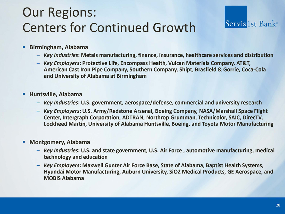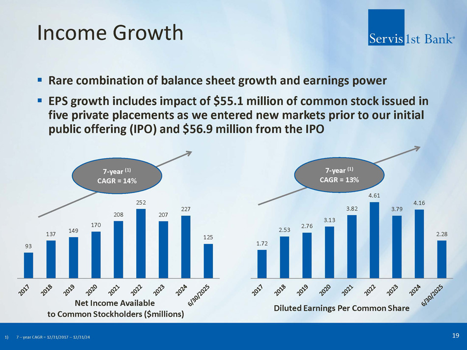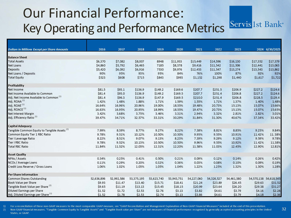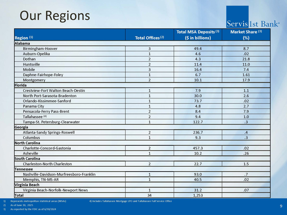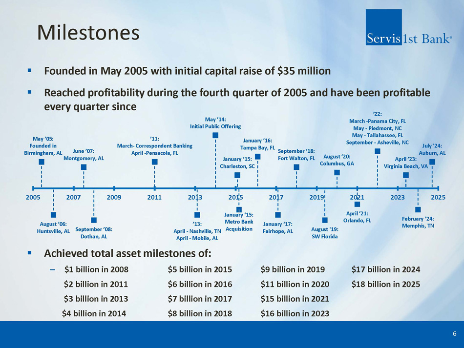 ServisFirst at a Glance Organic Growth Story ▪ Single bank BHC founded in Birmingham, Alabama ▪ Organic asset growth since the bank was founded in 2005 (1) : 24% CAGR High - Performing Metropolitan Commercial Bank ▪ Total Assets (2) : $17.38 billion ▪ Stockholders’ Equity (2) : $1.72 billion High Growth Coupled with Pristine Credit Metrics ▪ Gross Loans CAGR (4) : 14% ▪ Total Deposits CAGR (4) : 15% ▪ Net Income for Common CAGR (4) : 16% ▪ Diluted EPS CAGR (4) : 15% ▪ ROAA (3) : 1.42% ▪ Efficiency Ratio (3) : 34.22% 1) 19 - year compounded annual growth rate (CAGR) calculated from 12/31/05 – 12/31/2024; excludes the impact of ServisFirst’s one acquisition in 2015 – approximately $200 million 2) As of June 30, 2025 3) For six months ended June 30, 2025 4) 10 - year compounded annual growth rate (CAGR) calculated from 12/31/14 – 12/31/24 ▪ NPAs / assets (2) : 0.42% ▪ NPLs / loans (2) : 0.55% 3