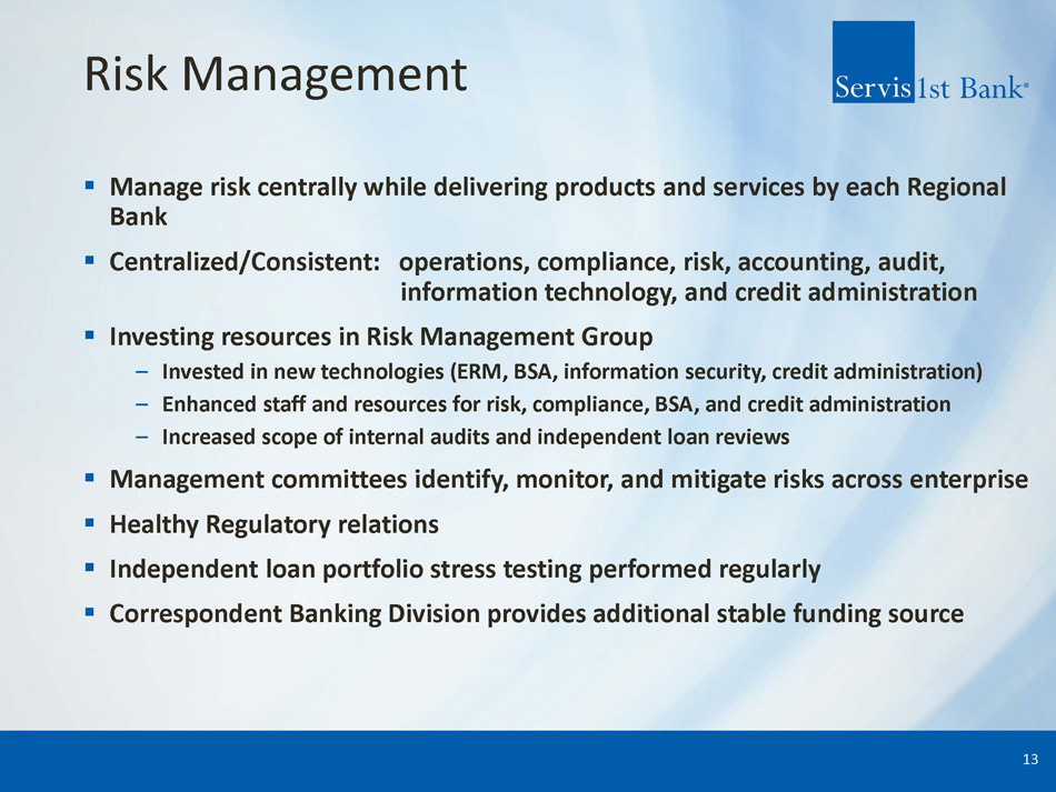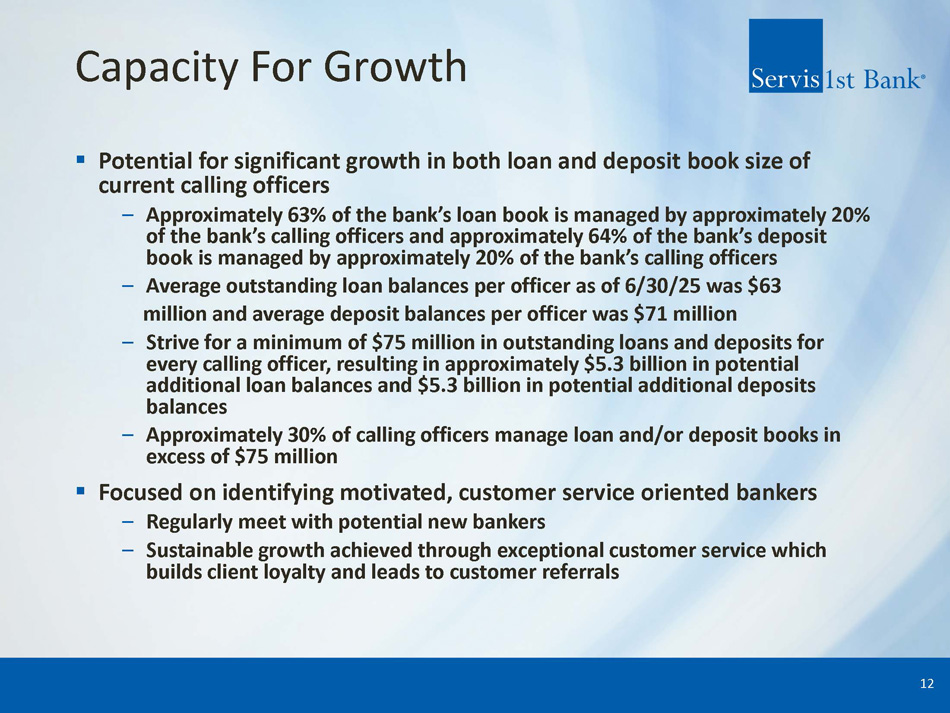 Scalable , Decentralized Structure ▪ Local decision - making – Emphasize local decision - making to drive customer revenue – Centralized, uniform risk management and support – Conservative local lending authorities, covers most lending decisions – Geographic organizational structure (as opposed to line of business structure) ▪ Regional CEOs empowered and held accountable – Utilize stock based compensation to align goals ▪ Top - down sales culture – Senior management actively involved in customer acquisition 11