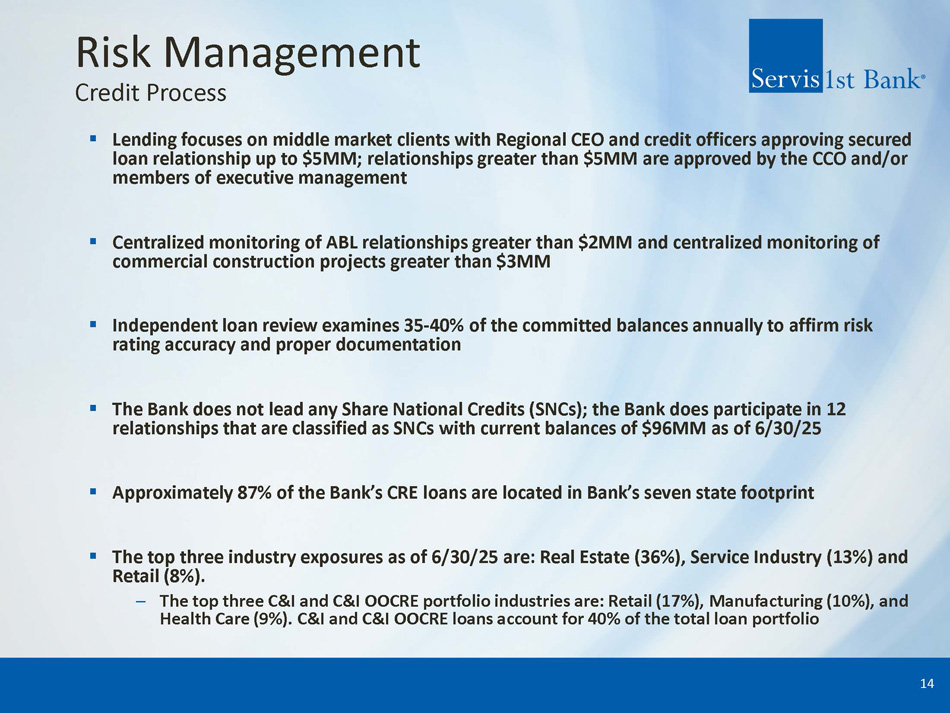 Risk Management ▪ Manage risk centrally while delivering products and services by each Regional Bank ▪ Centralized/Consistent: operations, compliance, risk, accounting, audit, information technology, and credit administration ▪ Investing resources in Risk Management Group – Invested in new technologies (ERM, BSA, information security, credit administration) – Enhanced staff and resources for risk, compliance, BSA, and credit administration – Increased scope of internal audits and independent loan reviews ▪ Management committees identify, monitor, and mitigate risks across enterprise ▪ Healthy Regulatory relations ▪ Independent loan portfolio stress testing performed regularly ▪ Correspondent Banking Division provides additional stable funding source 13