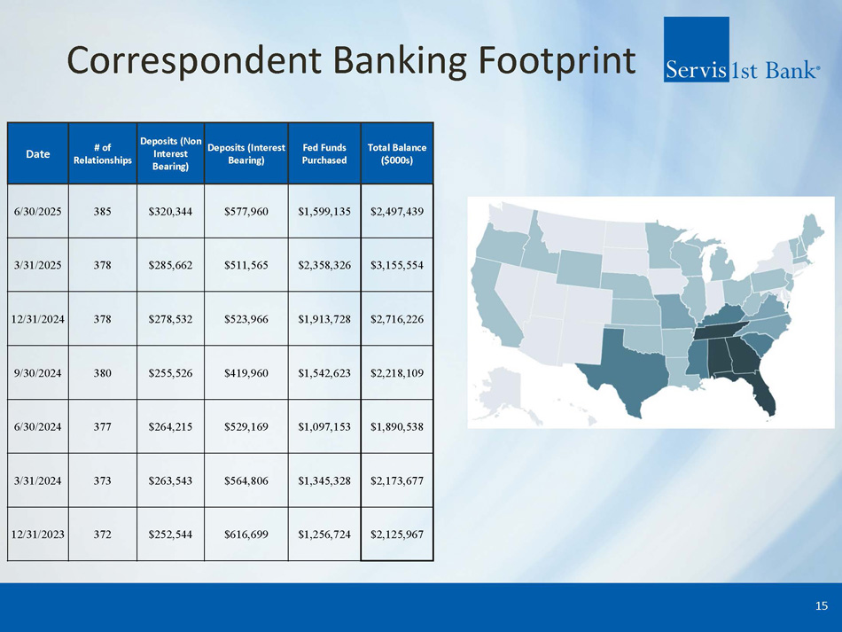 Risk Management Credit Process ▪ Lending focuses on middle market clients with Regional CEO and credit officers approving secured loan relationship up to $5MM; relationships greater than $5MM are approved by the CCO and/or members of executive management ▪ Centralized monitoring of ABL relationships greater than $2MM and centralized monitoring of commercial construction projects greater than $3MM ▪ Independent loan review examines 35 - 40% of the committed balances annually to affirm risk rating accuracy and proper documentation ▪ The Bank does not lead any Share National Credits (SNCs); the Bank does participate in 12 relationships that are classified as SNCs with current balances of $96MM as of 6/30/25 ▪ Approximately 87% of the Bank’s CRE loans are located in Bank’s seven state footprint ▪ The top three industry exposures as of 6/30/25 are: Real Estate (36%), Service Industry (13%) and Retail (8%). – The top three C&I and C&I OOCRE portfolio industries are: Retail (17%), Manufacturing (10%), and Health Care (9%). C&I and C&I OOCRE loans account for 40% of the total loan portfolio 14