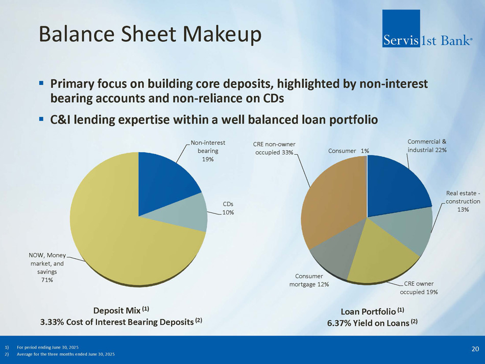 Income Growth ▪ Rare combination of balance sheet growth and earnings power ▪ EPS growth includes impact of $55.1 million of common stock issued in five private placements as we entered new markets prior to our initial public offering (IPO) and $56.9 million from the IPO 19 7 - year (1) CAGR = 14% 7 - year (1) CAGR = 13% Net Income Available to Common Stockholders ($millions) Diluted Earnings Per Common Share 1) 7 – year CAGR = 12/31/2017 – 12/31/24 93 137 149 170 208 252 207 227 125 1.72 2.53 2.76 3.13 3.82 4.61 3.79 4.16 2.28
