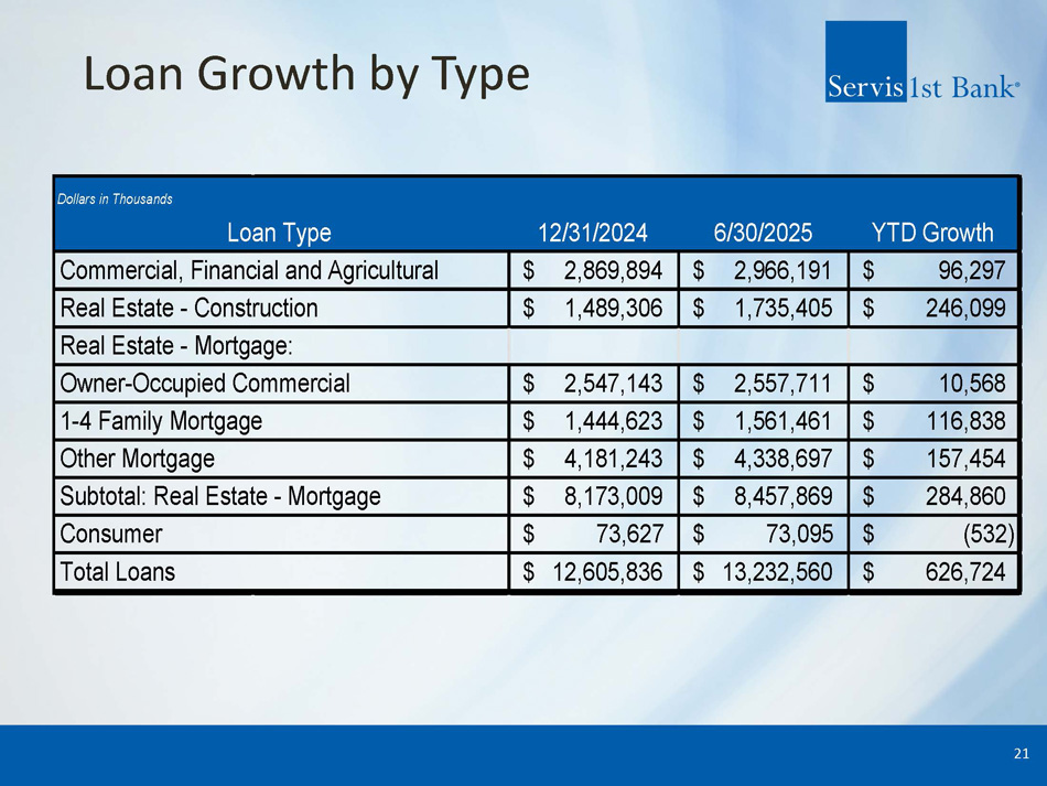 Balance Sheet Makeup ▪ Primary focus on building core deposits, highlighted by non - interest bearing accounts and non - reliance on CDs ▪ C&I lending expertise within a well balanced loan portfolio 20 Deposit Mix (1) 3.33% Cost of Interest Bearing Deposits (2 ) Loan Portfolio (1) 6.37% Yield on Loans (2) 1) For period ending June 30, 2025 2) Average for the three months ended June 30, 2025 Non - interest bearing 19% CDs 10% NOW, Money market, and savings 71% Commercial & industrial 22% Real estate - construction 13% CRE owner occupied 19% Consumer mortgage 12% CRE non - owner occupied 33% Consumer 1%