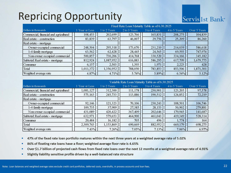 Loan Growth by Type 21 12/31/2024 6/30/2025 2,869,894$ 2,966,191$ 96,297$ 1,489,306$ 1,735,405$ 246,099$ 2,547,143$ 2,557,711$ 10,568$ 1,444,623$ 1,561,461$ 116,838$ 4,181,243$ 4,338,697$ 157,454$ 8,173,009$ 8,457,869$ 284,860$ 73,627$ 73,095$ (532)$ 12,605,836$ 13,232,560$ 626,724$ Total Loans Dollars in Thousands YTD GrowthLoan Type Commercial, Financial and Agricultural Real Estate - Construction Real Estate - Mortgage: Owner-Occupied Commercial 1-4 Family Mortgage Other Mortgage Subtotal: Real Estate - Mortgage Consumer