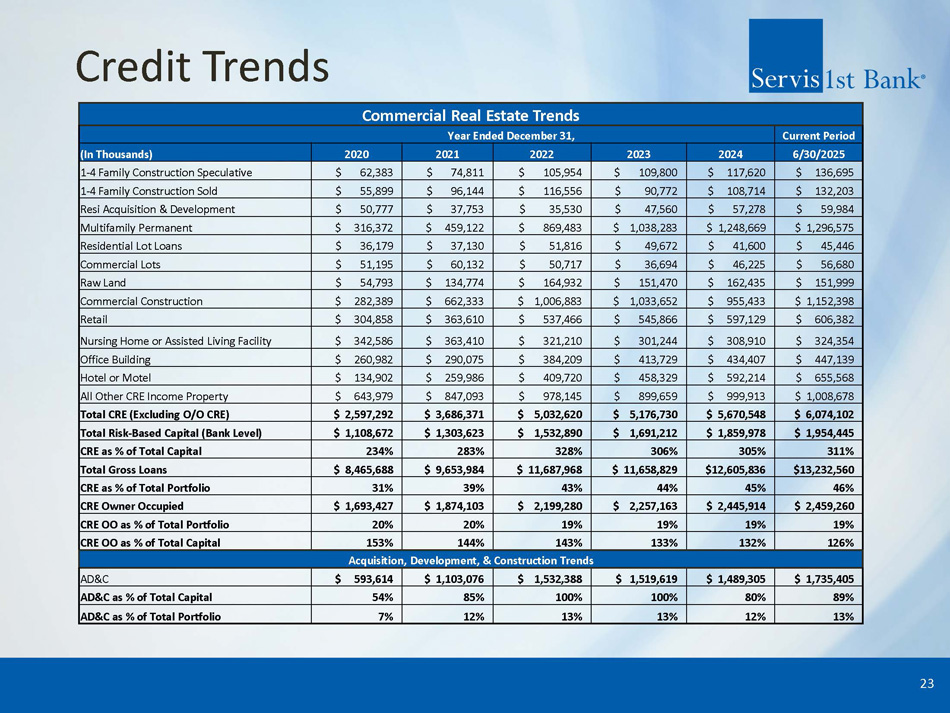 Credit Trends 23 Commercial Real Estate Trends Current Period Year Ended December 31, 6/30/2025 2024 2023 2022 2021 2020 (In Thousands) $ 136,695 $ 117,620 $ 109,800 $ 105,954 $ 74,811 $ 62,383 1 - 4 Family Construction Speculative $ 132,203 $ 108,714 $ 90,772 $ 116,556 $ 96,144 $ 55,899 1 - 4 Family Construction Sold $ 59,984 $ 57,278 $ 47,560 $ 35,530 $ 37,753 $ 50,777 Resi Acquisition & Development $ 1,296,575 $ 1,248,669 $ 1,038,283 $ 869,483 $ 459,122 $ 316,372 Multifamily Permanent $ 45,446 $ 41,600 $ 49,672 $ 51,816 $ 37,130 $ 36,179 Residential Lot Loans $ 56,680 $ 46,225 $ 36,694 $ 50,717 $ 60,132 $ 51,195 Commercial Lots $ 151,999 $ 162,435 $ 151,470 $ 164,932 $ 134,774 $ 54,793 Raw Land $ 1,152,398 $ 955,433 $ 1,033,652 $ 1,006,883 $ 662,333 $ 282,389 Commercial Construction $ 606,382 $ 597,129 $ 545,866 $ 537,466 $ 363,610 $ 304,858 Retail $ 324,354 $ 308,910 $ 301,244 $ 321,210 $ 363,410 $ 342,586 Nursing Home or Assisted Living Facility $ 447,139 $ 434,407 $ 413,729 $ 384,209 $ 290,075 $ 260,982 Office Building $ 655,568 $ 592,214 $ 458,329 $ 409,720 $ 259,986 $ 134,902 Hotel or Motel $ 1,008,678 $ 999,913 $ 899,659 $ 978,145 $ 847,093 $ 643,979 All Other CRE Income Property $ 6,074,102 $ 5,670,548 $ 5,176,730 $ 5,032,620 $ 3,686,371 $ 2,597,292 Total CRE (Excluding O/O CRE) $ 1,954,445 $ 1,859,978 $ 1,691,212 $ 1,532,890 $ 1,303,623 $ 1,108,672 Total Risk - Based Capital (Bank Level) 311% 305% 306% 328% 283% 234% CRE as % of Total Capital $13,232,560 $12,605,836 $ 11,658,829 $ 11,687,968 $ 9,653,984 $ 8,465,688 Total Gross Loans 46% 45% 44% 43% 39% 31% CRE as % of Total Portfolio $ 2,459,260 $ 2,445,914 $ 2,257,163 $ 2,199,280 $ 1,874,103 $ 1,693,427 CRE Owner Occupied 19% 19% 19% 19% 20% 20% CRE OO as % of Total Portfolio 126% 132% 133% 143% 144% 153% CRE OO as % of Total Capital Acquisition, Development, & Construction Trends $ 1,735,405 $ 1,489,305 $ 1,519,619 $ 1,532,388 $ 1,103,076 $ 593,614 AD&C 89% 80% 100% 100% 85% 54% AD&C as % of Total Capital 13% 12% 13% 13% 12% 7% AD&C as % of Total Portfolio