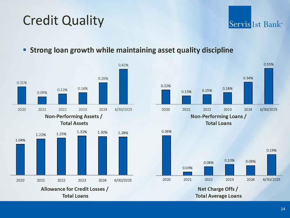 Credit Quality ▪ Strong loan growth while maintaining asset quality discipline 24 Allowance for Credit Losses / Total Loans Net Charge Offs / Total Average Loans Non - Performing Assets / Total Assets Non - Performing Loans / Total Loans 0.21% 0.09% 0.12% 0.14% 0.26% 0.42% 2020 2021 2022 2023 2024 6/30/2025 0.22% 0.13% 0.15% 0.18% 0.34% 0.55% 2020 2021 2022 2023 2024 6/30/2025 0.36% 0.03% 0.08% 0.10% 0.09% 0.19% 2020 2021 2022 2023 2024 6/30/2025 1.04% 1.22% 1.25% 1.32% 1.30% 1.28% 2020 2021 2022 2023 2024 6/30/2025