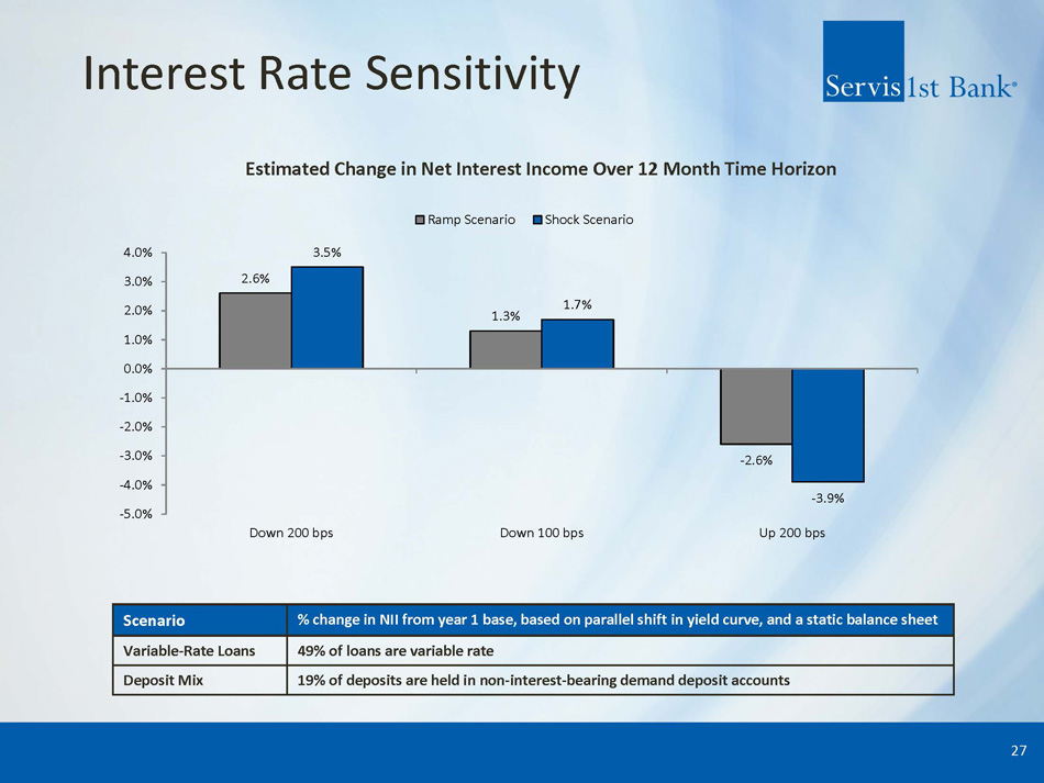 41.54% 38.69% 38.75% 40.60% 39.47% 34.71% 32.57% 33.28% 30.29% 31.84% 31.30% 38.28% 37.34% 33.42% 1.64% 1.51% 1.47% 1.55% 1.41% 1.32% 1.26% 1.20% 1.05% 0.98% 1.07% 1.11% 1.11% 1.03% 0.00% 1.00% 2.00% 3.00% 4.00% 5.00% 0.00% 10.00% 20.00% 30.00% 40.00% 50.00% 60.00% 70.00% Core Efficiency Ratio Core Non-interest Expense / Average Assets Efficiency ▪ Our operating structure and business strategy enable efficient, profitable growth 26 Adjusted Efficiency Ratio (1) and Adj. Non - interest Expense / Average Assets (1) (1) (1) 1) For a reconciliation of these non - GAAP measures to the most comparable GAAP measure, see "GAAP Reconciliation and Management Explanation of Non - GAAP Financial Measures" included at the end of this presentation .