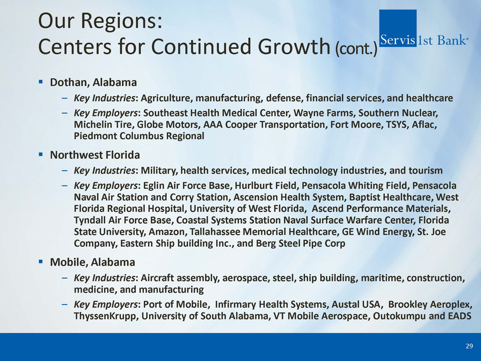 Our Regions: Centers for Continued Growth ▪ Birmingham, Alabama – Key Industries : Metals manufacturing, finance, insurance, healthcare services and distribution – Key Employers : Protective Life, Encompass Health, Vulcan Materials Company, AT&T, American Cast Iron Pipe Company, Southern Company, Shipt , Brasfield & Gorrie, Coca - Cola and University of Alabama at Birmingham ▪ Huntsville, Alabama – Key Industries : U.S. government, aerospace/defense, commercial and university research – Key Employers : U.S. Army/Redstone Arsenal, Boeing Company, NASA/Marshall Space Flight Center, Intergraph Corporation, ADTRAN, Northrop Grumman, Technicolor, SAIC, DirecTV, Lockheed Martin, University of Alabama Huntsville, Boeing, and Toyota Motor Manufacturing ▪ Montgomery, Alabama – Key Industries : U.S. and state government, U.S. Air Force , automotive manufacturing, medical technology and education – Key Employers : Maxwell Gunter Air Force Base, State of Alabama, Baptist Health Systems, Hyundai Motor Manufacturing, Auburn University, SiO2 Medical Products, GE Aerospace, and MOBIS Alabama 28