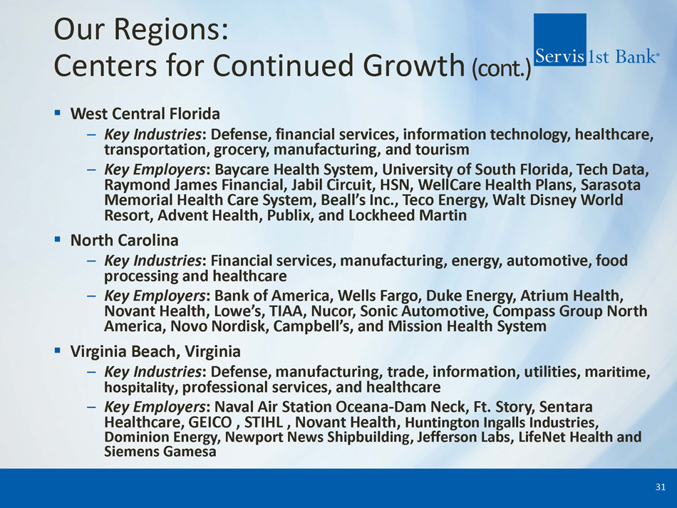 Our Regions: Centers for Continued Growth (cont.) ▪ Tennessee – Key Industries : Healthcare, manufacturing, entertainment, transportation, education and technology – Key Employers : HCA Holdings, Nissan North America, Dollar General Corporation, Asurion, Community Health Systems, FedEx, AutoZone, Vanderbilt University, BlueCross BlueShield and International Paper ▪ Charleston, South Carolina – Key Industries : Maritime, information technology, higher education, military, manufacturing, and tourism – Key Employers : Joint Base Charleston, Medical University of South Carolina, Roper St. Francis Healthcare, Boeing Company, Robert Bosch LLC, Blackbaud, Trident Health, Mercedes - Benz Vans and SAIC ▪ Atlanta, Georgia – Key Industries : Logistics, media, information technology, education and entertainment – Key Employers : Coca - Cola Company, Home Depot, Delta Air Lines, AT&T Mobility, UPS, Newell - Rubbermaid, Cable News Network, Georgia Tech, Lockheed Martin and Cox Enterprises 30