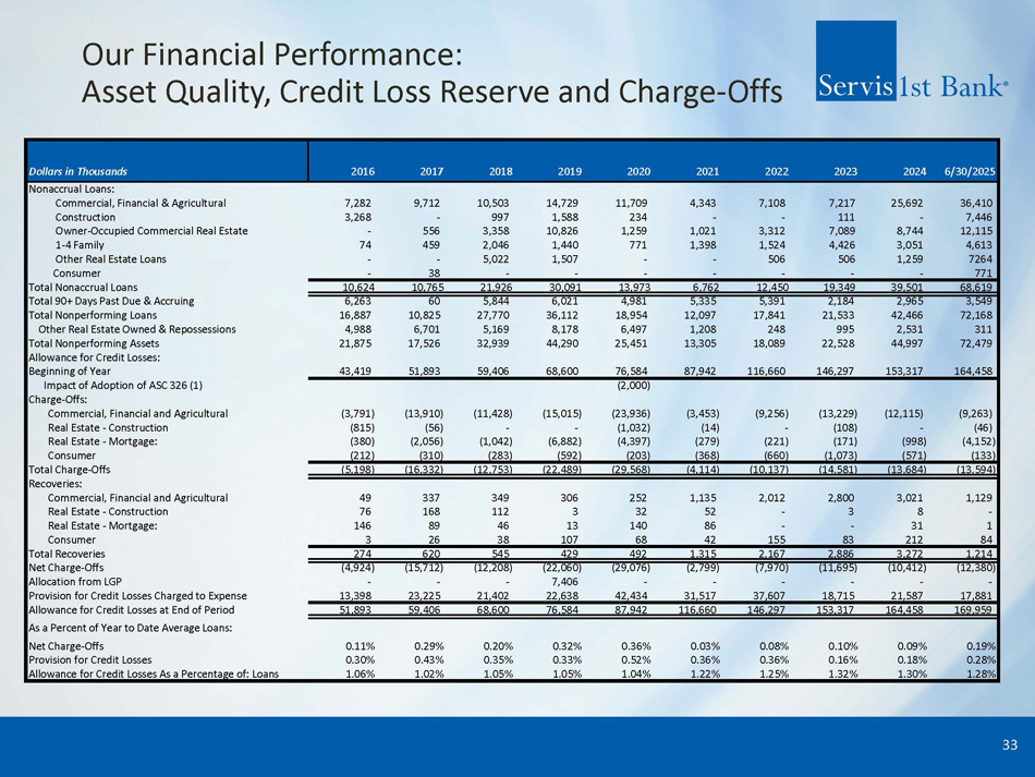 Our Financial Performance: Key Operating and Performance Metrics 32 1) For a reconciliation of these non - GAAP measures to the most comparable GAAP measure, see "GAAP Reconciliation and Management Exp lanation of Non - GAAP Financial Measures" included at the end of this presentation. 2) Non - GAAP financial measures. "Tangible Common Equity to Tangible Assets" and "Tangible Book value per Share" are not measures o f financial performance recognized by generally accepted accounting principles in the United States, or GAAP. Dollars in Millions Except per Share Amounts 6/30/2025 2024 2023 2022 2021 2020 2019 2018 2017 2016 Balance Sheet $ 17,379 $17,352 $16,130 $14,596 $15,449 $11,933 8948 $8,007 $7,082 $6,370 Total Assets $1 3,063 $12,441 $11,506 $11,542 $9,416 $8,378 7185 $6,465 $5,792 $4,860 Net Loans $1 3,862 $13,543 $13,274 $11,547 $12,453 $9,976 7530 $6,916 $6,092 $5,420 Deposits 92 % 92% 87% 100% 76% 84% 95% 93% 95% 90% Net Loans / Deposits $ 1,722 $1,617 $1,440 $1,298 $1,152 $993 $843 $715 $608 $523 Total Equity Profitability $ 124.6 $227.2 $206.9 $251.5 $207.7 $169.6 $149.2 $136.9 $93.1 $81.5 Net Income $ 124.6 $227.2 $206.8 $251.4 $207.7 $169.5 $149.2 $136.9 $93.0 $81.4 Net Income Available to Common $ 129.4 $22 8 . 5 $206.8 $251.4 $210.0 $169.5 $147.9 $136.9 $96.3 $81.4 Adj. Net Income Available to Common (1) 1. 48 % 1. 40 % 1.37% 1.71% 1.55% 1.59% 1.71% 1.88% 1.48% 1.42% Adj. ROAA (1) 1 5.66 % 1 5.07 % 15.13% 20.73% 19.48% 18.55% 19.00% 20.96% 16.96% 16.64% Adj. ROAE (1) 1 5.65 % 1 5.07 % 15.13% 20.73% 19.47% 18.55% 18.99% 20.95% 16.95% 16.63% Adj. ROACE (1) 3.01 % 2.82% 2.81% 3.32% 2.94% 3.31% 3.46% 3.75% 3.68% 3.42% Net Interest Margin 3 3.42 % 37. 34 % 40.67% 31.30% 31.84% 30.29% 33.31% 32.57% 34.71% 39.47% Adj. Efficiency Ratio (1) Capital Adequacy 9.84 % 9.25% 8.85% 8.81% 7.38% 8.22% 9.27% 8.77% 8.39% 7.99% Tangible Common Equity to Tangible Assets (2) 11. 38 % 11. 42 % 10 . 9 1 % 9.55% 9.95% 10.50% 10.50% 10.12% 9.51% 9.78% Common Equity Tier 1 RBC Ratio 9. 78 % 9.5 9 % 9.12% 9.29% 7.39% 8.23% 9.13% 9.07% 8.51% 8.22% Tier I Leverage Ratio 11. 38 % 11. 42 % 10.92% 9.55% 9.96% 10.50% 10.50% 10.13% 9.52% 9.78% Tier I RBC Ratio 12. 81 % 12. 90 % 12.45% 11.03% 11.58% 12.20% 12.31% 12.05% 11.52% 11.84% Total RBC Ratio Asset Quality 0. 42 % 0. 2 6% 0.1 4 % 0.12% 0.09% 0.21% 0.50% 0.41% 0.25% 0.34% NPAs / Assets 0. 19 % 0.0 9 % 0. 10 % 0.08% 0.03% 0.36% 0.32% 0.20% 0. 29 % 0.11% NCOs / Average Loans 1. 28 % 1.30% 1.32% 1.25% 1.22% 1.04% 1.05% 1.05% 1.02% 1.06% Credit Loss Reserve / Gross Loans Per Share Information 54, 618,545 54,5 70 , 138 54,461,580 54,326,527 54,227,060 53,943,751 53,623,740 53,375,195 52,992,586 52,636,896 Common Shares Outstanding $ 31.52 $29.63 $26.45 $23.89 $21.24 $18.41 $15.71 $13.40 $11.47 $9.93 Book Value per Share $ 31.27 $29.38 $26.20 $23.64 $20.99 $18.15 $15.45 $13.13 $11.19 $9.65 Tangible Book Value per Share (2) $ 2.28 $4.16 $3.79 $4.61 $3.82 $3.13 $2.76 $2.53 $1.72 $1.52 Diluted Earnings per Share $ 2.36 $4.1 8 $3.79 $4.61 $3.86 $3.13 $2.74 $2.53 $1.78 $1.52 Adj. Diluted Earnings per Share (1)