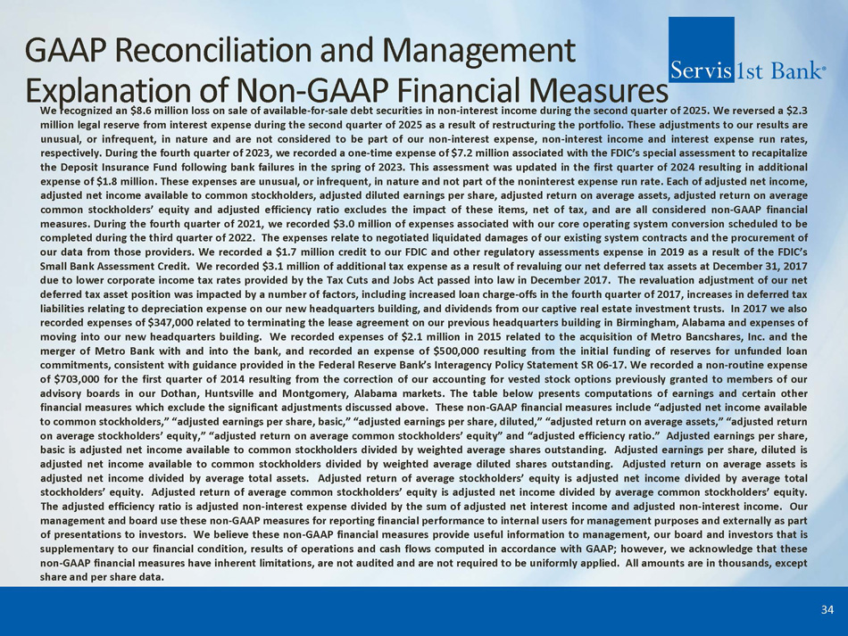GAAP Reconciliation and Management Explanation of Non - GAAP Financial Measures We recognized an $ 8 . 6 million loss on sale of available - for - sale debt securities in non - interest income during the second quarter of 2025 . We reversed a $ 2 . 3 million legal reserve from interest expense during the second quarter of 2025 as a result of restructuring the portfolio . These adjustments to our results are unusual, or infrequent, in nature and are not considered to be part of our non - interest expense, non - interest income and interest expense run rates, respectively . During the fourth quarter of 2023 , we recorded a one - time expense of $ 7 . 2 million associated with the FDIC’s special assessment to recapitalize the Deposit Insurance Fund following bank failures in the spring of 2023 . This assessment was updated in the first quarter of 2024 resulting in additional expense of $ 1 . 8 million . These expenses are unusual, or infrequent, in nature and not part of the noninterest expense run rate . Each of adjusted net income, adjusted net income available to common stockholders, adjusted diluted earnings per share, adjusted return on average assets, adjusted return on average common stockholders’ equity and adjusted efficiency ratio excludes the impact of these items, net of tax, and are all considered non - GAAP financial measures . During the fourth quarter of 2021 , we recorded $ 3 . 0 million of expenses associated with our core operating system conversion scheduled to be completed during the third quarter of 2022 . The expenses relate to negotiated liquidated damages of our existing system contracts and the procurement of our data from those providers . We recorded a $ 1 . 7 million credit to our FDIC and other regulatory assessments expense in 2019 as a result of the FDIC’s Small Bank Assessment Credit . We recorded $ 3 . 1 million of additional tax expense as a result of revaluing our net deferred tax assets at December 31 , 2017 due to lower corporate income tax rates provided by the Tax Cuts and Jobs Act passed into law in December 2017 . The revaluation adjustment of our net deferred tax asset position was impacted by a number of factors, including increased loan charge - offs in the fourth quarter of 2017 , increases in deferred tax liabilities relating to depreciation expense on our new headquarters building, and dividends from our captive real estate investment trusts . In 2017 we also recorded expenses of $ 347 , 000 related to terminating the lease agreement on our previous headquarters building in Birmingham, Alabama and expenses of moving into our new headquarters building . We recorded expenses of $ 2 . 1 million in 2015 related to the acquisition of Metro Bancshares, Inc . and the merger of Metro Bank with and into the bank, and recorded an expense of $ 500 , 000 resulting from the initial funding of reserves for unfunded loan commitments, consistent with guidance provided in the Federal Reserve Bank’s Interagency Policy Statement SR 06 - 17 . We recorded a non - routine expense of $ 703 , 000 for the first quarter of 2014 resulting from the correction of our accounting for vested stock options previously granted to members of our advisory boards in our Dothan, Huntsville and Montgomery, Alabama markets . The table below presents computations of earnings and certain other financial measures which exclude the significant adjustments discussed above . These non - GAAP financial measures include “adjusted net income available to common stockholders,” “adjusted earnings per share, basic,” “adjusted earnings per share, diluted,” “adjusted return on average assets,” “adjusted return on average stockholders’ equity,” “adjusted return on average common stockholders’ equity” and “adjusted efficiency ratio . ” Adjusted earnings per share, basic is adjusted net income available to common stockholders divided by weighted average shares outstanding . Adjusted earnings per share, diluted is adjusted net income available to common stockholders divided by weighted average diluted shares outstanding . Adjusted return on average assets is adjusted net income divided by average total assets . Adjusted return of average stockholders’ equity is adjusted net income divided by average total stockholders’ equity . Adjusted return of average common stockholders’ equity is adjusted net income divided by average common stockholders’ equity . The adjusted efficiency ratio is adjusted non - interest expense divided by the sum of adjusted net interest income and adjusted non - interest income . Our management and board use these non - GAAP measures for reporting financial performance to internal users for management purposes and externally as part of presentations to investors . We believe these non - GAAP financial measures provide useful information to management, our board and investors that is supplementary to our financial condition, results of operations and cash flows computed in accordance with GAAP ; however, we acknowledge that these non - GAAP financial measures have inherent limitations, are not audited and are not required to be uniformly applied . All amounts are in thousands, except share and per share data . 34