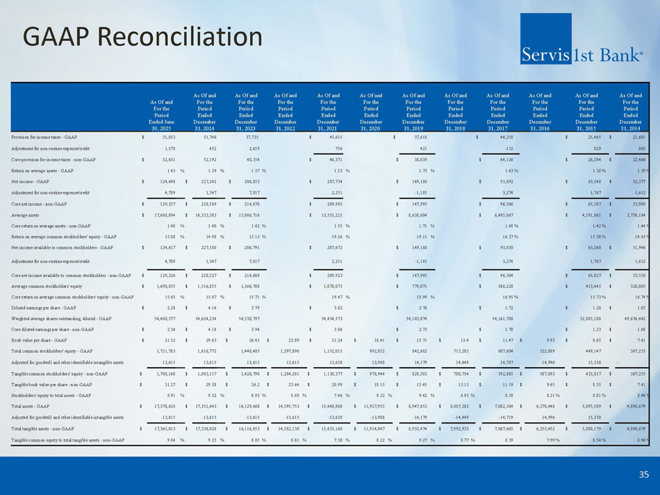 GAAP Reconciliation 35 As Of and For the Period Ended December 31, 2014 As Of and For the Period Ended December 31, 2015 As Of and For the Period Ended December 31, 2016 As Of and For the Period Ended December 31, 2017 As Of and For the Period Ended December 31, 2018 As Of and For the Period Ended December 31, 2019 As Of and For the Period Ended December 31, 2020 As Of and For the Period Ended December 31, 2021 As Of and For the Period Ended December 31, 2022 As Of and For the Period Ended December 31, 2023 As Of and For the Period Ended December 31, 2024 As Of and For the Period Ended June 30, 2025 21,601 $ 25,465 $ 44,258 $ 37,618 $ 45,615 $ 37,735 51,740 31,053 $ Provision for income taxes - GAAP 865 829 - 132 421 756 2,619 452 1,578 Adjustment for non - routine expense/credit 22,466 $ 26,294 $ 44,126 $ 38,039 $ 46,371 $ 40,354 52,192 32,631 $ Core provision for income taxes - non - GAAP % 1.39 % 1.38 % 1.43 % 1.73 % 1.53 % 1.37 % 1.39 % 1.43 Return on average assets - GAAP 52,377 $ 63,540 $ 93,092 $ 149,180 $ 207,734 $ 206,853 $ 227,242 $ 124,648 $ Net income - GAAP 1,612 1,767 3,274 - 1,185 2,251 7,817 1,347 4,709 Adjustment for non - routine expense/credit 53,989 $ 65,307 $ 96,366 $ 147,995 $ 209,985 $ 214,670 $ 228,589 $ 129,357 $ Core net income - non - GAAP 3,758,184 $ 4,591,861 $ 6,495,067 $ 8,638,604 $ 13,555,221 $ 15,066,716 $ 16,333,383 $ 17,668,094 $ Average assets % 1.44 % 1.42 % 1.48 % 1.71 % 1.55 % 1.42 % 1.40 % 1.48 Core return on average assets - non - GAAP % 14.43 % 15.30 % 16.37 % 19.15 % 19.26 % 15.13 % 14.98 % 15.08 Return on average common stockholders' equity - GAAP 51,946 $ 63,260 $ 93,030 $ 149,180 $ 207,672 $ 206,791 $ 227,180 $ 124,617 $ Net income available to common stockholders - GAAP 1,612 1,767 3,274 - 1,185 2,251 7,817 1,347 4,709 Adjustment for non - routine expense/credit 53,558 $ 65,027 $ 96,304 $ 147,995 $ 209,923 $ 214,608 $ 228,527 $ 129,326 $ Core net income available to common stockholders - non - GAAP 320,005 $ 413,445 $ 568,228 $ 779,071 $ 1,078,075 $ 1,366,708 $ 1,516,855 $ 1,690,855 $ Average common stockholders' equity % 16.74 % 15.73 % 16.95 % 18.99 % 19.47 % 15.71 % 15.07 % 15.65 Core return on average common stockholders' equity - non - GAAP 1.05 $ 1.20 $ 1.72 $ 2.76 $ 3.82 $ 3.79 $ 4.16 $ 2.28 $ Diluted earnings per share - GAAP 49,636,442 52,885,108 54,161,788 54,103,074 54,434,573 54,530,797 54,624,234 54,660,577 Weighted average shares outstanding, diluted - GAAP 1.08 $ 1.23 $ 1.78 $ 2.73 $ 3.86 $ 3.94 $ 4.18 $ 2.36 $ Core diluted earnings per share - non - GAAP 7.41 $ 8.65 $ 9.93 $ 11.47 $ 13.4 $ 15.71 $ 18.41 $ 21.24 $ 23.89 $ 26.45 $ 29.63 $ 31.52 $ Book value per share - GAAP 367,255 449,147 522,889 607,604 715,203 842,682 992,852 1,152,015 1,297,896 1,440,405 1,616,772 1,721,783 Total common stockholders' equity - GAAP - 15,330 14,996 14,787 14,449 14,179 13,908 13,638 13,615 13,615 13,615 13,615 Adjusted for goodwill and other identifiable intangible assets 367,255 $ 433,817 $ 507,893 $ 592,885 $ 700,754 $ 828,503 $ 978,944 $ 1,138,377 $ 1,284,281 $ 1,426,790 $ 1,603,157 $ 1,708,168 $ Tangible common stockholders' equity - non - GAAP 7.41 $ 8.35 $ 9.65 $ 11.19 $ 13.13 $ 15.45 $ 18.15 $ 20.99 $ 23.64 $ 26.2 $ 29.38 $ 31.27 $ Tangible book value per share - non - GAAP % 8.96 % 8.81 % 8.21 8.58 % 8.93 % 9.42 % 8.32 % 7.46 % 8.89 % 8.93 % 9.32 % 9.91 Stockholders' equity to total assets - GAAP 4,098,679 $ 5,095,509 $ 6,370,448 $ 7,082,384 $ 8,007,382 $ 8,947,653 $ 11,927,955 $ 15,448,806 $ 14,595,753 $ 16,129,668 $ 17,351,643 $ 17,378,628 $ Total assets - GAAP - 15,330 14,996 - 14,719 - 14,449 - 14,179 - 13,908 - 13,638 - 13,615 - 13,615 - 13,615 - 13,615 Adjusted for goodwill and other identifiable intangible assets 4,098,679 $ 5,080,179 $ 6,355,452 $ 7,067,665 $ 7,992,933 $ 8,933,474 $ 11,914,047 $ 15,435,168 $ 14,582,138 $ 16,116,053 $ 17,338,028 $ 17,365,013 $ Total tangible assets - non - GAAP % 8.96 % 8.54 % 7.99 8.39 % 8.77 % 9.27 % 8.22 % 7.38 % 8.81 % 8.85 % 9.25 % 9.84 Tangible common equity to total tangible assets - non - GAAP