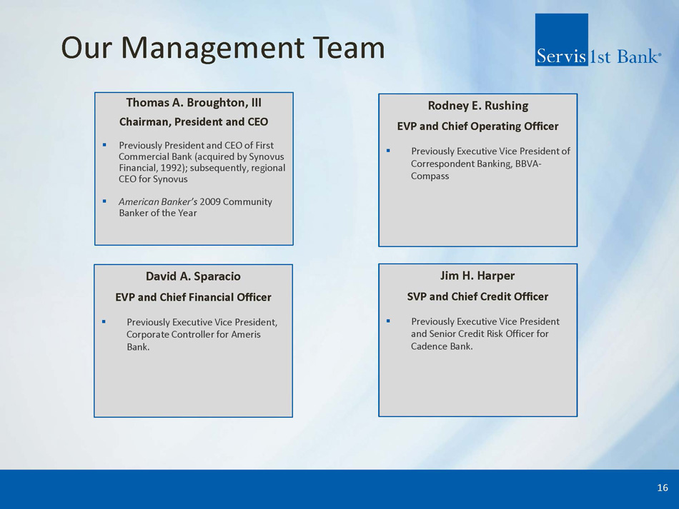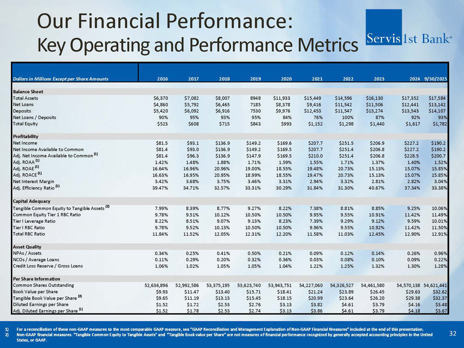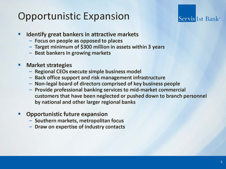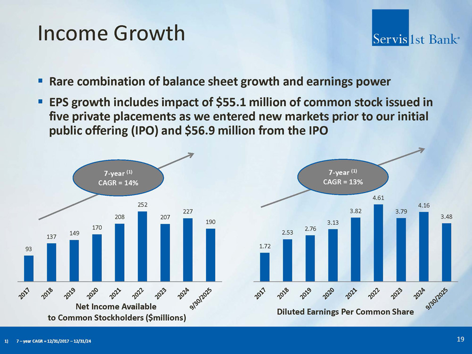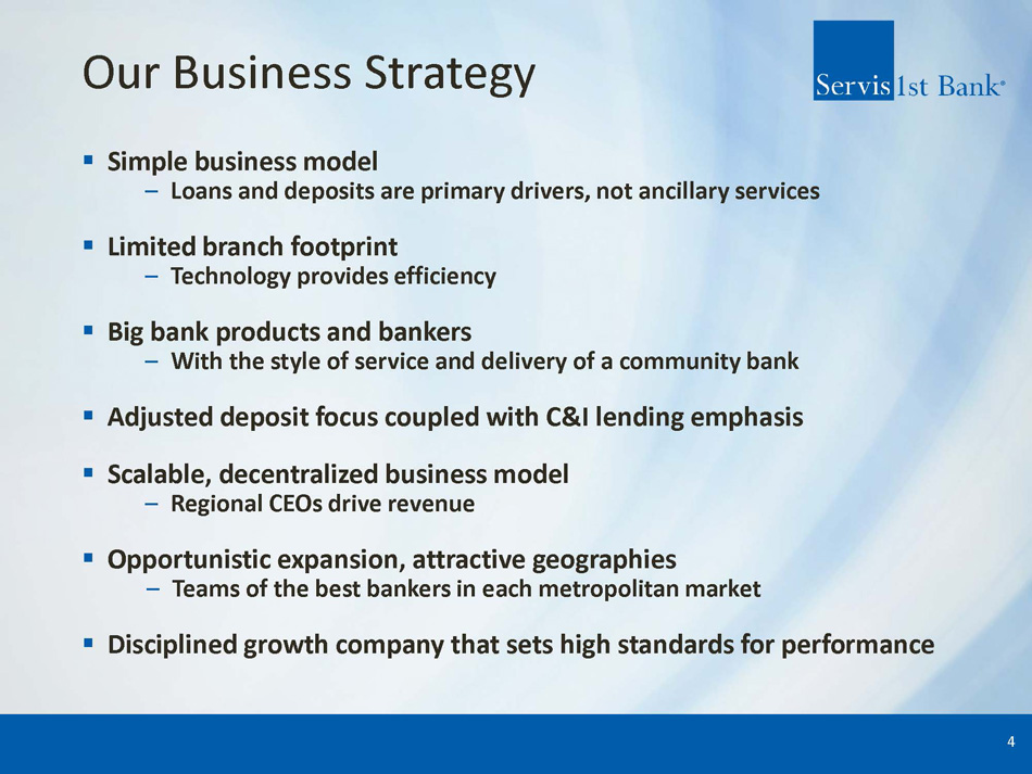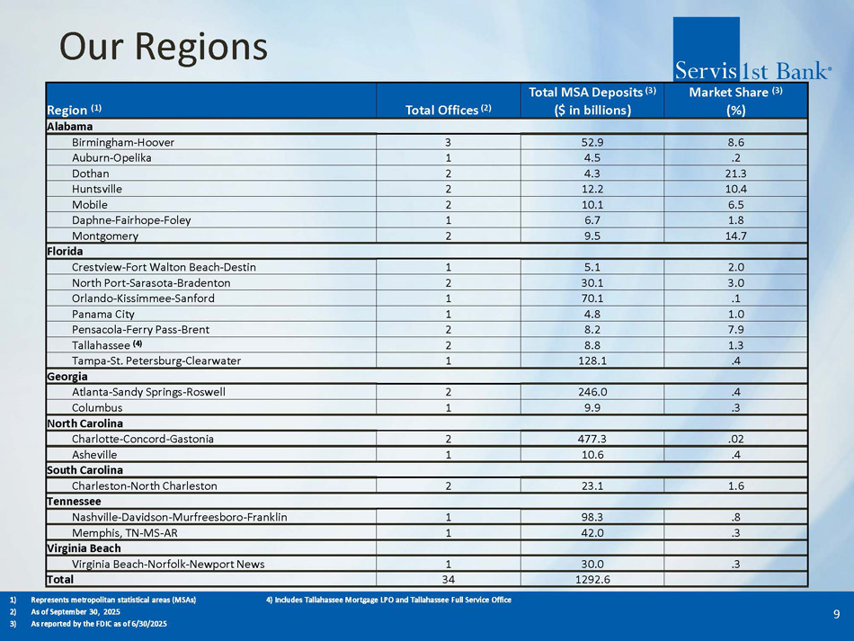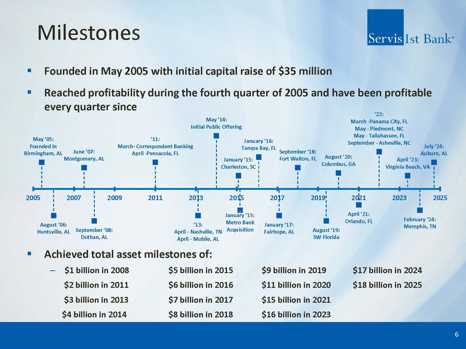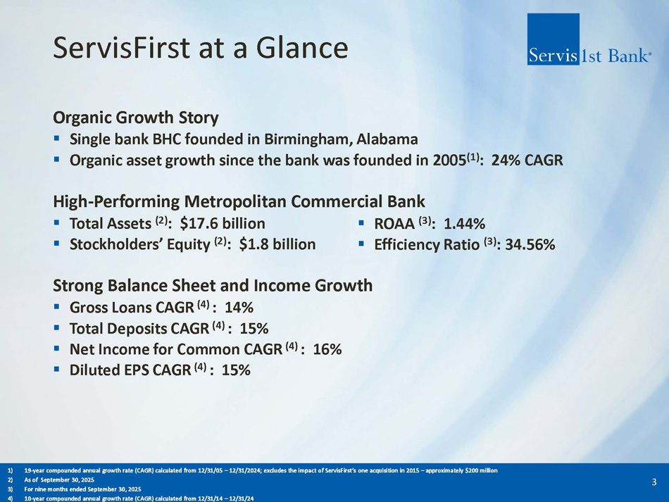 ServisFirst at a Glance Organic Growth Story ▪ Single bank BHC founded in Birmingham, Alabama ▪ Organic asset growth since the bank was founded in 2005 (1) : 24% CAGR High - Performing Metropolitan Commercial Bank ▪ Total Assets (2) : $17.6 billion ▪ Stockholders’ Equity (2) : $1.8 billion Strong Balance Sheet and Income Growth ▪ Gross Loans CAGR (4) : 14% ▪ Total Deposits CAGR (4) : 15% ▪ Net Income for Common CAGR (4) : 16% ▪ Diluted EPS CAGR (4) : 15% ▪ ROAA (3) : 1.44% ▪ Efficiency Ratio (3) : 34.56% 1) 19 - year compounded annual growth rate (CAGR) calculated from 12/31/05 – 12/31/2024; excludes the impact of ServisFirst’s one acquisition in 2015 – approximately $200 million 2) As of September 30, 2025 3) For nine months ended September 30, 2025 4) 10 - year compounded annual growth rate (CAGR) calculated from 12/31/14 – 12/31/24 3