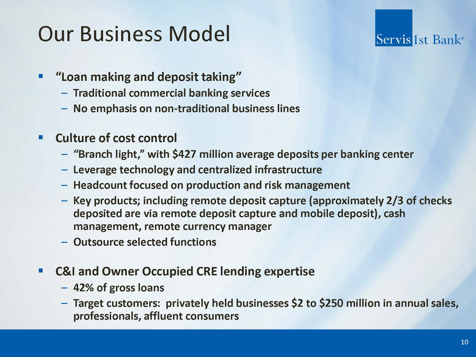 Our Regions 9 1) Represents metropolitan statistical areas (MSAs) 4) Includes Tallahassee Mortgage LPO and Tallahassee Full Service Office 2) As of September 30, 2025 3) As reported by the FDIC as of 6/30/2025 Market Share (3) Total MSA Deposits (3) Total Offices (2) Region (1) (%) ($ in billions ) Alabama 8.6 52.9 3 Birmingham - Hoover .2 4.5 1 Auburn - Opelika 21.3 4.3 2 Dothan 10.4 12.2 2 Huntsville 6.5 10.1 2 Mobile 1.8 6.7 1 Daphne - Fairhope - Foley 14.7 9.5 2 Montgomery Florida 2.0 5.1 1 Crestview - Fort Walton Beach - Destin 3.0 30.1 2 North Port - Sarasota - Bradenton .1 70.1 1 Orlando - Kissimmee - Sanford 1.0 4.8 1 Panama City 7.9 8.2 2 Pensacola - Ferry Pass - Brent 1.3 8.8 2 Tallahassee (4) .4 128.1 1 Tampa - St . Petersburg - Clearwater Georgia .4 246.0 2 Atlanta - Sandy Springs - Roswell .3 9.9 1 Columbus North Carolina .02 477.3 2 Charlotte - Concord - Gastonia .4 10.6 1 Asheville South Carolina 1.6 23.1 2 Charleston - North Charleston Tennessee .8 98.3 1 Nashville - Davidson - Murfreesboro - Franklin .3 42.0 1 Memphis, TN - MS - AR Virginia Beach .3 30.0 1 Virginia Beach - Norfolk - Newport News 1292.6 34 Total