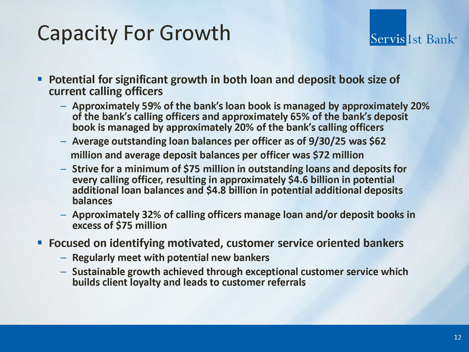 Scalable , Decentralized Structure ▪ Local decision - making – Emphasize local decision - making to drive customer revenue – Centralized, uniform risk management and support – Conservative local lending authorities, covers most lending decisions – Geographic organizational structure (as opposed to line of business structure) ▪ Regional CEOs empowered and held accountable – Utilize stock based compensation to align goals ▪ Top - down sales culture – Senior management actively involved in customer acquisition 11
