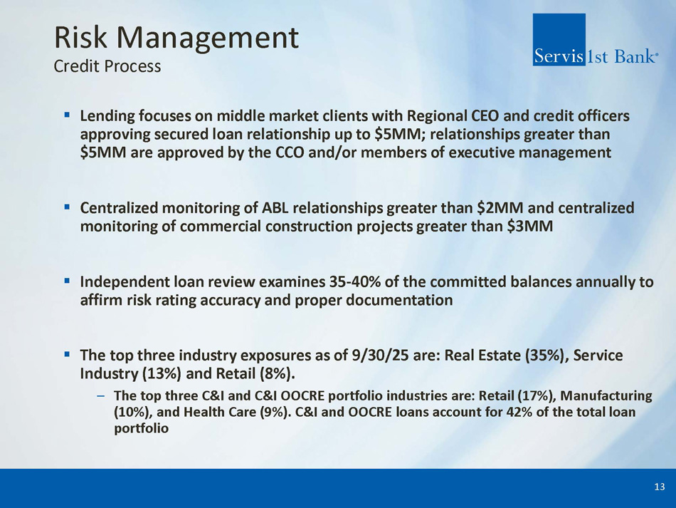 Capacity For Growth ▪ Potential for significant growth in both loan and deposit book size of current calling officers – Approximately 59% of the bank’s loan book is managed by approximately 20% of the bank’s calling officers and approximately 65% of the bank’s deposit book is managed by approximately 20% of the bank’s calling officers – Average outstanding loan balances per officer as of 9/30/25 was $62 million and average deposit balances per officer was $72 million – Strive for a minimum of $75 million in outstanding loans and deposits for every calling officer, resulting in approximately $4.6 billion in potential additional loan balances and $4.8 billion in potential additional deposits balances – Approximately 32% of calling officers manage loan and/or deposit books in excess of $75 million ▪ Focused on identifying motivated, customer service oriented bankers – Regularly meet with potential new bankers – Sustainable growth achieved through exceptional customer service which builds client loyalty and leads to customer referrals 12