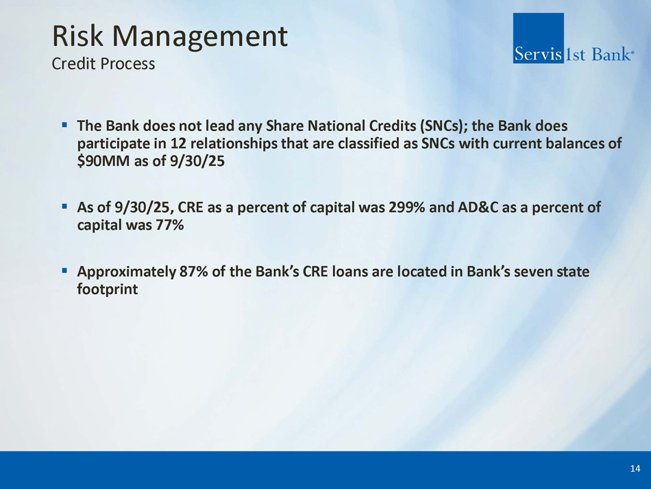 Risk Management Credit Process ▪ Lending focuses on middle market clients with Regional CEO and credit officers approving secured loan relationship up to $5MM; relationships greater than $5MM are approved by the CCO and/or members of executive management ▪ Centralized monitoring of ABL relationships greater than $2MM and centralized monitoring of commercial construction projects greater than $3MM ▪ Independent loan review examines 35 - 40% of the committed balances annually to affirm risk rating accuracy and proper documentation ▪ The top three industry exposures as of 9/30/25 are: Real Estate (35%), Service Industry (13%) and Retail (8%). – The top three C&I and C&I OOCRE portfolio industries are: Retail (17%), Manufacturing (10%), and Health Care (9%). C&I and OOCRE loans account for 42% of the total loan portfolio 13