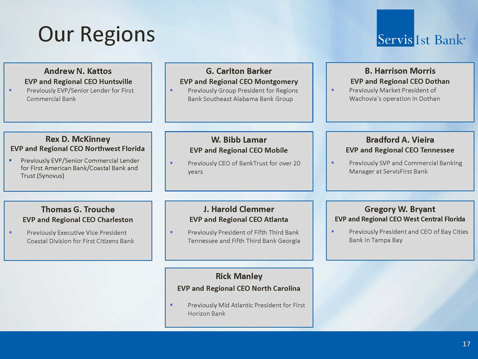 Our Management Team Thomas A. Broughton, III Chairman, President and CEO ▪ Previously President and CEO of First Commercial Bank (acquired by Synovus Financial, 1992); subsequently, regional CEO for Synovus ▪ American Banker’s 2009 Community Banker of the Year David A. Sparacio EVP and Chief Financial Officer ▪ Previously Executive Vice President, Corporate Controller for Ameris Bank. Rodney E. Rushing EVP and Chief Operating Officer ▪ Previously Executive Vice President of Correspondent Banking, BBVA - Compass 16 Jim H. Harper SVP and Chief Credit Officer ▪ Previously Executive Vice President and Senior Credit Risk Officer for Cadence Bank.