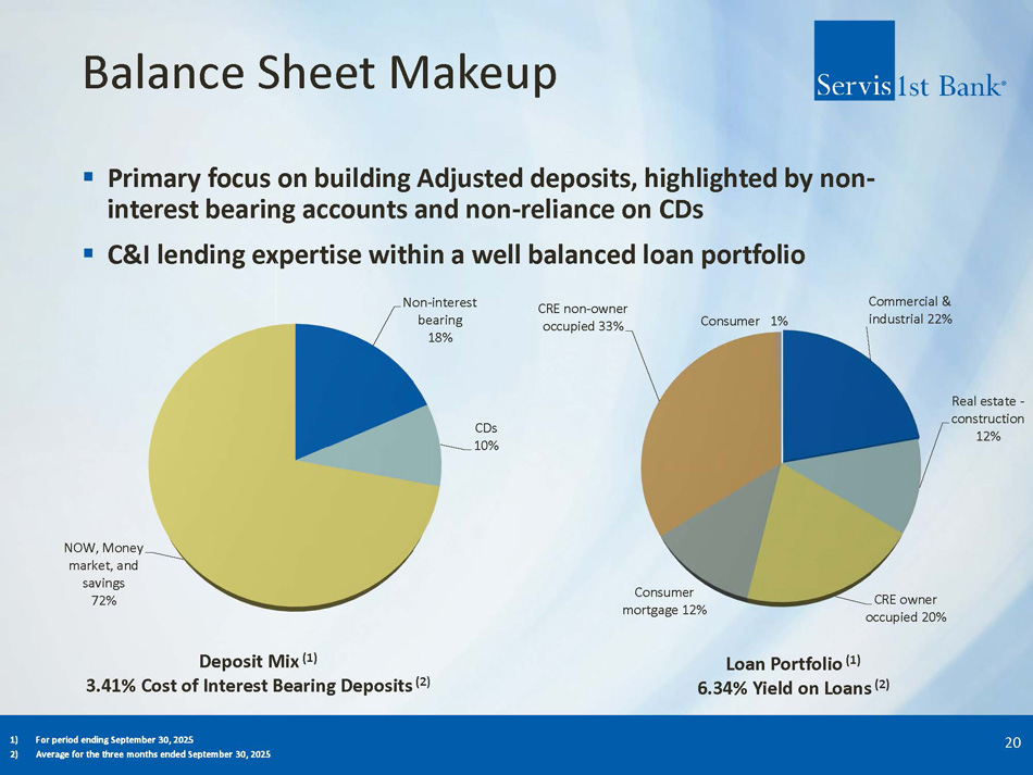 Income Growth ▪ Rare combination of balance sheet growth and earnings power ▪ EPS growth includes impact of $55.1 million of common stock issued in five private placements as we entered new markets prior to our initial public offering (IPO) and $56.9 million from the IPO 19 7 - year (1) CAGR = 14% 7 - year (1) CAGR = 13% Net Income Available to Common Stockholders ($millions) Diluted Earnings Per Common Share 1) 7 – year CAGR = 12/31/2017 – 12/31/24 93 137 149 170 208 252 207 227 190 1.72 2.53 2.76 3.13 3.82 4.61 3.79 4.16 3.48