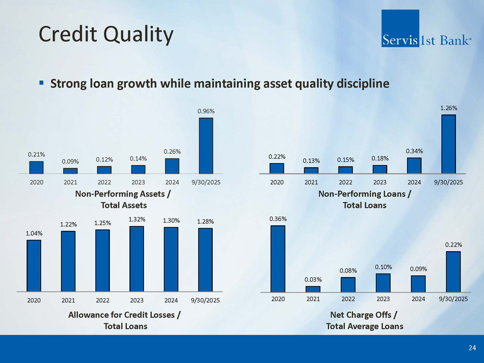 Credit Quality ▪ Strong loan growth while maintaining asset quality discipline 24 Allowance for Credit Losses / Total Loans Net Charge Offs / Total Average Loans Non - Performing Assets / Total Assets Non - Performing Loans / Total Loans 0.21% 0.09% 0.12% 0.14% 0.26% 0.96% 2020 2021 2022 2023 2024 9/30/2025 0.22% 0.13% 0.15% 0.18% 0.34% 1.26% 2020 2021 2022 2023 2024 9/30/2025 0.36% 0.03% 0.08% 0.10% 0.09% 0.22% 2020 2021 2022 2023 2024 9/30/2025 1.04% 1.22% 1.25% 1.32% 1.30% 1.28% 2020 2021 2022 2023 2024 9/30/2025