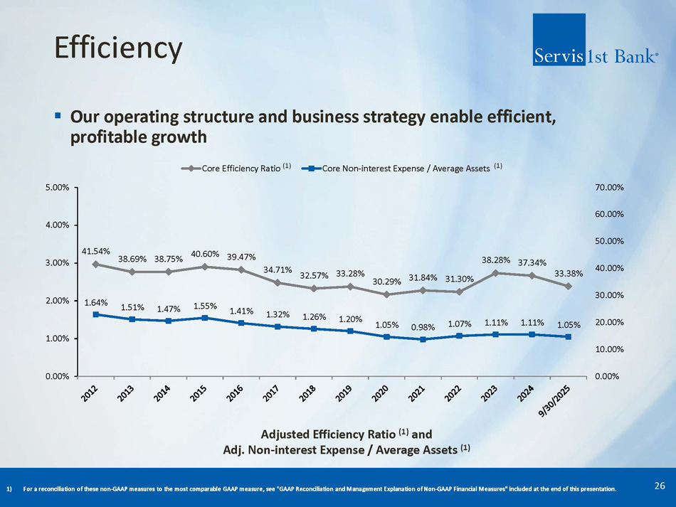 Profitability Metrics ▪ Consistent earnings results and strong momentum 25 Adjusted Return on Average Assets (1) Adjusted Return on Average Equity (1) Adjusted Return on Average Common Equity (1) Net Interest Margin 1) For a reconciliation of these non - GAAP measures to the most comparable GAAP measure, see "GAAP Reconciliation and Management Exp lanation of Non - GAAP Financial Measures" included at the end of this presentation. 1.59% 1.55% 1.71% 1.42% 1.40% 1.52% 2020 2021 2022 2023 2024 9/30/2025 18.55% 19.47% 20.73% 15.71% 15.07% 15.85% 2020 2021 2022 2023 2024 9/30/2025 3.31% 2.94% 3.32% 2.81% 2.83% 3.04% 2020 2021 2022 2023 2024 9/30/2025 18.55% 19.48% 20.73% 15.71% 15.07% 15.85% 2020 2021 2022 2023 2024 9/30/2025