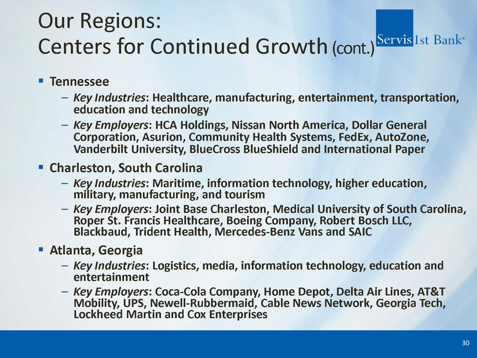 Our Regions: Centers for Continued Growth (cont.) ▪ Dothan, Alabama – Key Industries : Agriculture, manufacturing, defense, financial services, and healthcare – Key Employers : Southeast Health Medical Center, Wayne Farms, Southern Nuclear, Michelin Tire, Globe Motors, AAA Cooper Transportation, Fort Moore, TSYS, Aflac, Piedmont Columbus Regional ▪ Northwest Florida – Key Industries : Military, health services, medical technology industries, and tourism – Key Employers : Eglin Air Force Base, Hurlburt Field, Pensacola Whiting Field, Pensacola Naval Air Station and Corry Station, Ascension Health System, Baptist Healthcare, West Florida Regional Hospital, University of West Florida, Ascend Performance Materials, Tyndall Air Force Base, Coastal Systems Station Naval Surface Warfare Center, Florida State University, Amazon, Tallahassee Memorial Healthcare, GE Wind Energy, St. Joe Company, Eastern Ship building Inc., and Berg Steel Pipe Corp ▪ Mobile, Alabama – Key Industries : Aircraft assembly, aerospace, steel, ship building, maritime, construction, medicine, and manufacturing – Key Employers : Port of Mobile, Infirmary Health Systems, Austal USA, Brookley Aeroplex , ThyssenKrupp, University of South Alabama, VT Mobile Aerospace, Outokumpu and EADS 29