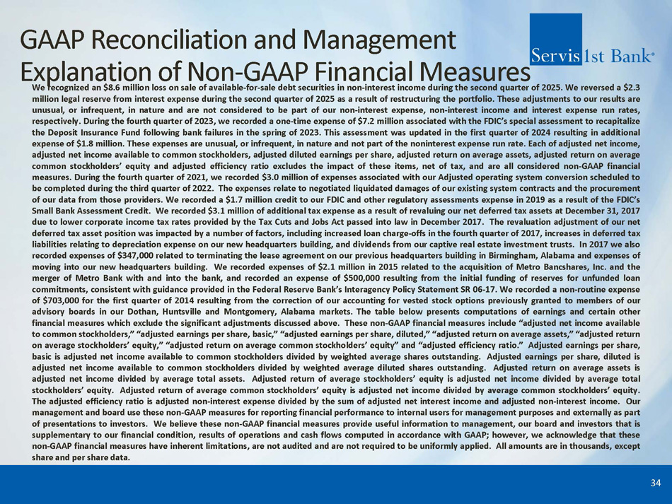 GAAP Reconciliation and Management Explanation of Non - GAAP Financial Measures We recognized an $ 8 . 6 million loss on sale of available - for - sale debt securities in non - interest income during the second quarter of 2025 . We reversed a $ 2 . 3 million legal reserve from interest expense during the second quarter of 2025 as a result of restructuring the portfolio . These adjustments to our results are unusual, or infrequent, in nature and are not considered to be part of our non - interest expense, non - interest income and interest expense run rates, respectively . During the fourth quarter of 2023 , we recorded a one - time expense of $ 7 . 2 million associated with the FDIC’s special assessment to recapitalize the Deposit Insurance Fund following bank failures in the spring of 2023 . This assessment was updated in the first quarter of 2024 resulting in additional expense of $ 1 . 8 million . These expenses are unusual, or infrequent, in nature and not part of the noninterest expense run rate . Each of adjusted net income, adjusted net income available to common stockholders, adjusted diluted earnings per share, adjusted return on average assets, adjusted return on average common stockholders’ equity and adjusted efficiency ratio excludes the impact of these items, net of tax, and are all considered non - GAAP financial measures . During the fourth quarter of 2021 , we recorded $ 3 . 0 million of expenses associated with our Adjusted operating system conversion scheduled to be completed during the third quarter of 2022 . The expenses relate to negotiated liquidated damages of our existing system contracts and the procurement of our data from those providers . We recorded a $ 1 . 7 million credit to our FDIC and other regulatory assessments expense in 2019 as a result of the FDIC’s Small Bank Assessment Credit . We recorded $ 3 . 1 million of additional tax expense as a result of revaluing our net deferred tax assets at December 31 , 2017 due to lower corporate income tax rates provided by the Tax Cuts and Jobs Act passed into law in December 2017 . The revaluation adjustment of our net deferred tax asset position was impacted by a number of factors, including increased loan charge - offs in the fourth quarter of 2017 , increases in deferred tax liabilities relating to depreciation expense on our new headquarters building, and dividends from our captive real estate investment trusts . In 2017 we also recorded expenses of $ 347 , 000 related to terminating the lease agreement on our previous headquarters building in Birmingham, Alabama and expenses of moving into our new headquarters building . We recorded expenses of $ 2 . 1 million in 2015 related to the acquisition of Metro Bancshares, Inc . and the merger of Metro Bank with and into the bank, and recorded an expense of $ 500 , 000 resulting from the initial funding of reserves for unfunded loan commitments, consistent with guidance provided in the Federal Reserve Bank’s Interagency Policy Statement SR 06 - 17 . We recorded a non - routine expense of $ 703 , 000 for the first quarter of 2014 resulting from the correction of our accounting for vested stock options previously granted to members of our advisory boards in our Dothan, Huntsville and Montgomery, Alabama markets . The table below presents computations of earnings and certain other financial measures which exclude the significant adjustments discussed above . These non - GAAP financial measures include “adjusted net income available to common stockholders,” “adjusted earnings per share, basic,” “adjusted earnings per share, diluted,” “adjusted return on average assets,” “adjusted return on average stockholders’ equity,” “adjusted return on average common stockholders’ equity” and “adjusted efficiency ratio . ” Adjusted earnings per share, basic is adjusted net income available to common stockholders divided by weighted average shares outstanding . Adjusted earnings per share, diluted is adjusted net income available to common stockholders divided by weighted average diluted shares outstanding . Adjusted return on average assets is adjusted net income divided by average total assets . Adjusted return of average stockholders’ equity is adjusted net income divided by average total stockholders’ equity . Adjusted return of average common stockholders’ equity is adjusted net income divided by average common stockholders’ equity . The adjusted efficiency ratio is adjusted non - interest expense divided by the sum of adjusted net interest income and adjusted non - interest income . Our management and board use these non - GAAP measures for reporting financial performance to internal users for management purposes and externally as part of presentations to investors . We believe these non - GAAP financial measures provide useful information to management, our board and investors that is supplementary to our financial condition, results of operations and cash flows computed in accordance with GAAP ; however, we acknowledge that these non - GAAP financial measures have inherent limitations, are not audited and are not required to be uniformly applied . All amounts are in thousands, except share and per share data . 34